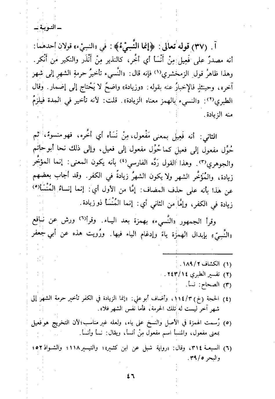 قوله تعالى: {إِنَّمَا النسياء} : في «النسِيْء» قولان أحدهما: أنه مصدرٌ على فَعِيل مِنْ أَنْسَأ أي أخَّر، كالنذير مِنْ أَنْذَر والنكير من أَنْكر. وهذا ظاهرُ قولِ الزمخشري فإنه قال: «النَّسيء تأخيرُ حرمةِ الشهرِ إلى شهر آخر» ، وحينئذٍ فالإِخبارُ عنه بقوله: «وزيادة» واضحٌ لا يَحْتاج إلى إضمار. وقال الطبري: النسيء بالهمز معناه الزيادة «. قلت: لأنه تأخير في المدة فيلزمُ منه الزيادة.