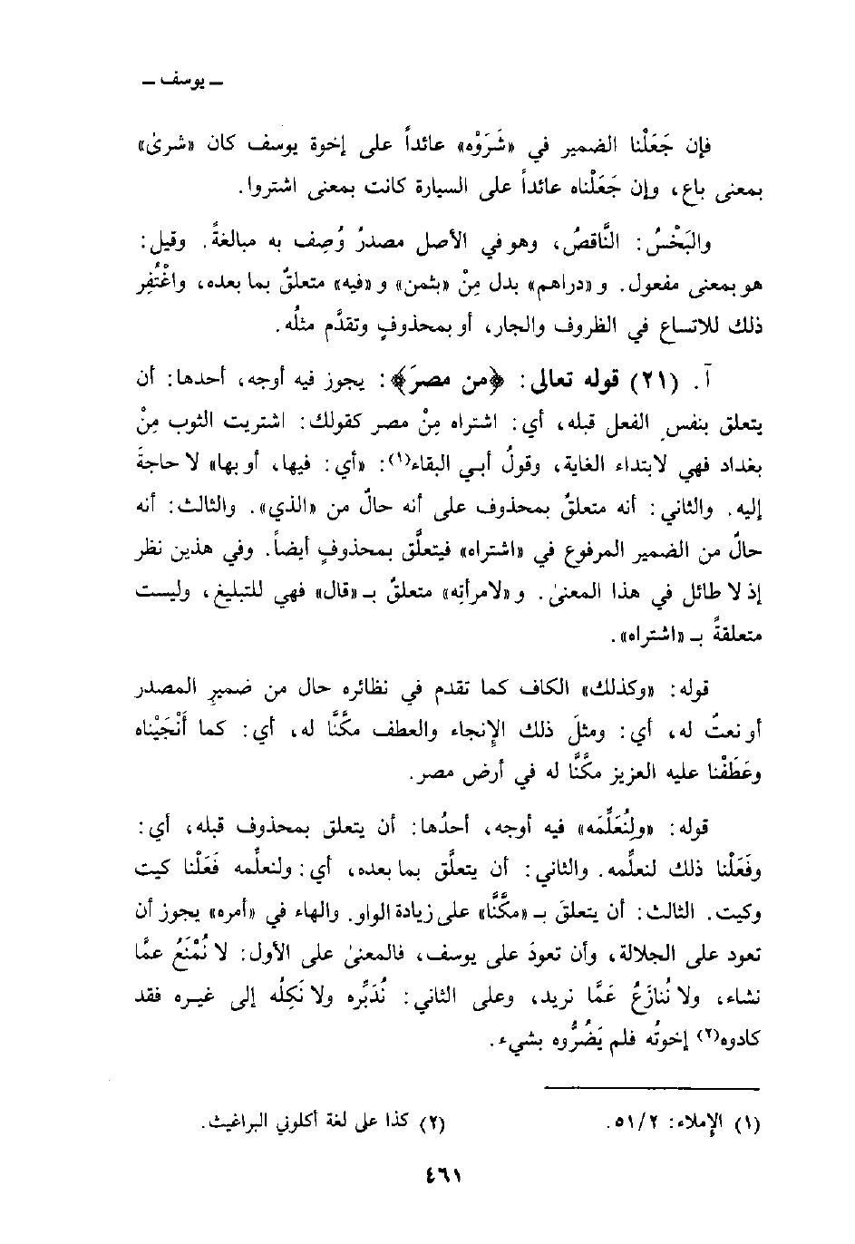 قوله تعالى: {مِن مِّصْرَ} : يجوز فيه أوجه، أحدها: أن يتعلق بنفسِ الفعل قبله، أي: اشتراه مِنْ مصر كقولك: اشتريت الثوب مِنْ بغداد فهي لابتداء الغاية، وقولُ أبي البقاء: «أي: فيها، أو بها» لا حاجةَ إليه. والثاني: أنه متعلقٌ بمحذوف على أنه حالٌ من «الذي» . والثالث: أنه حالٌ من الضمير المرفوع في «اشتراه» فيتعلَّق بمحذوفٍ أيضاً. وفي هذين نظر إذ لا طائل في هذا المعنى. و «لأمرأتِه» متعلقٌ ب «قال» فهي للتبليغ، وليست متعلقةً ب «اشتراه» .