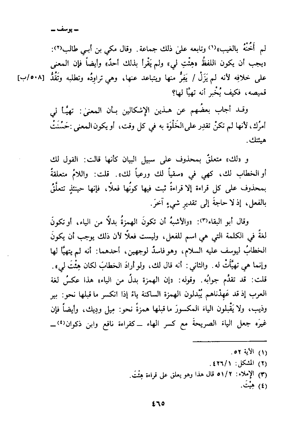 لَمْ أَخُنْهُ بالغيب} [يوسف: 52] وتابعه على ذلك جماعة. وقال مكي بن أبي طالب:» يجب أن يكون اللفظُ «هِئْتِ لي» ولم يَقْرأ بذلك أحدٌ «وأيضاً فإن المعنى على خلافِه لأنه لم يَزَلْ/ يَفِرُّ منها ويتباعد عنها، وهي تراوِدُه وتطلبه وتَقُدُّ قميصه، فكيف يُخْبر أنها تهيَّأ لها؟