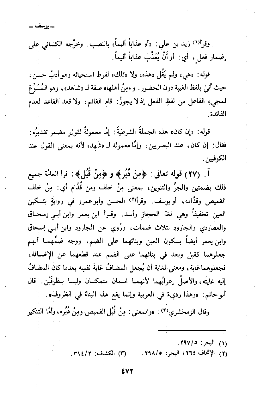 قوله تعالى: {مِن دُبُرٍ} و {مِن قُبُلٍ} : قرأ العامَّة جميع ذلك بضمتين والجرِّ والتنوين، بمعنى مِنْ خلف ومن قُدَّام أي: مِنْ خلف القميص وقدَّامه، أو يوسف. وقرأ الحسن وأبو عمرو في روايةٍ بتسكين العين تخفيفاً وهي لغة الحجاز وأسد. وقرأ ابن يعمر وابن أبي إسحاق والعطاردي والجارود بثلاث ضمات، ورُوي عن الجارود وابن أبي إسحاق وابن يعمر وأيضاً بسكون العين وبنائهما على الضم، ووجه ضمِّهما أنهم جعلوهما كقبل وبعد في بنائهما على الضم عند قطعهما عن الإِضافة، فجعلوهما غاية، ومعنى الغاية أن يُجعل المضافُ غايةَ نفسِه بعدما كان المضافُ إليه غايتَه، والأصلُ إعرابُهما لأنهما اسمان متمكنان وليسا بظرفَيْن. قال أبو حاتم: «وهذا رديءٌ في العربية وإنما يقع هذا البناءُ في الظروف» .