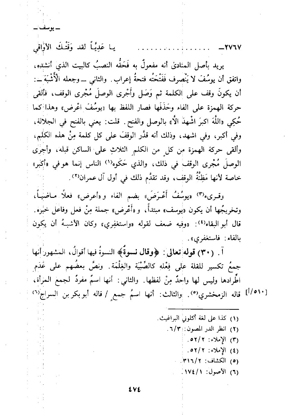 يريد بأصل المنادى أنه مفعولٌ به فَحَقُّه النصبُ كالبيت الذي أنشده، واتفق أن يوسُفَ لا يَنْصرف فَفَتْحَتُه فتحةُ إعراب. والثاني وجعله الأَشْبَه: أن يكونَ وقف على الكلمة ثم وَصَل وأَجْرى الوصلَ مُجْرى الوقف، فألقى حركة الهمزة على الفاء وحَذَفَها فصار اللفظ بها «يوسُفَ اعْرض» وهذا كما حُكِي «اللَّهَ اكبرَ اشْهدَ الاَّ» بالوصل والفتح. قلت: يعني بالفتح في الجلالة، وفي أكبر، وفي اشهد، وذلك أنه قدَّر الوقفَ على كل كلمة مِنْ هذه الكلم، وألقى حركة الهمزة من كلٍ من الكلمِ الثلاثِ على الساكن قبله، وأجرى الوصلَ مُجرى الوقف في ذلك، والذي حَكَوه الناس إنما هو في «أكبر» خاصة لأنها مَظِنَّةُ الوقف، وقد تقدَّم ذلك في أول آل عمران.