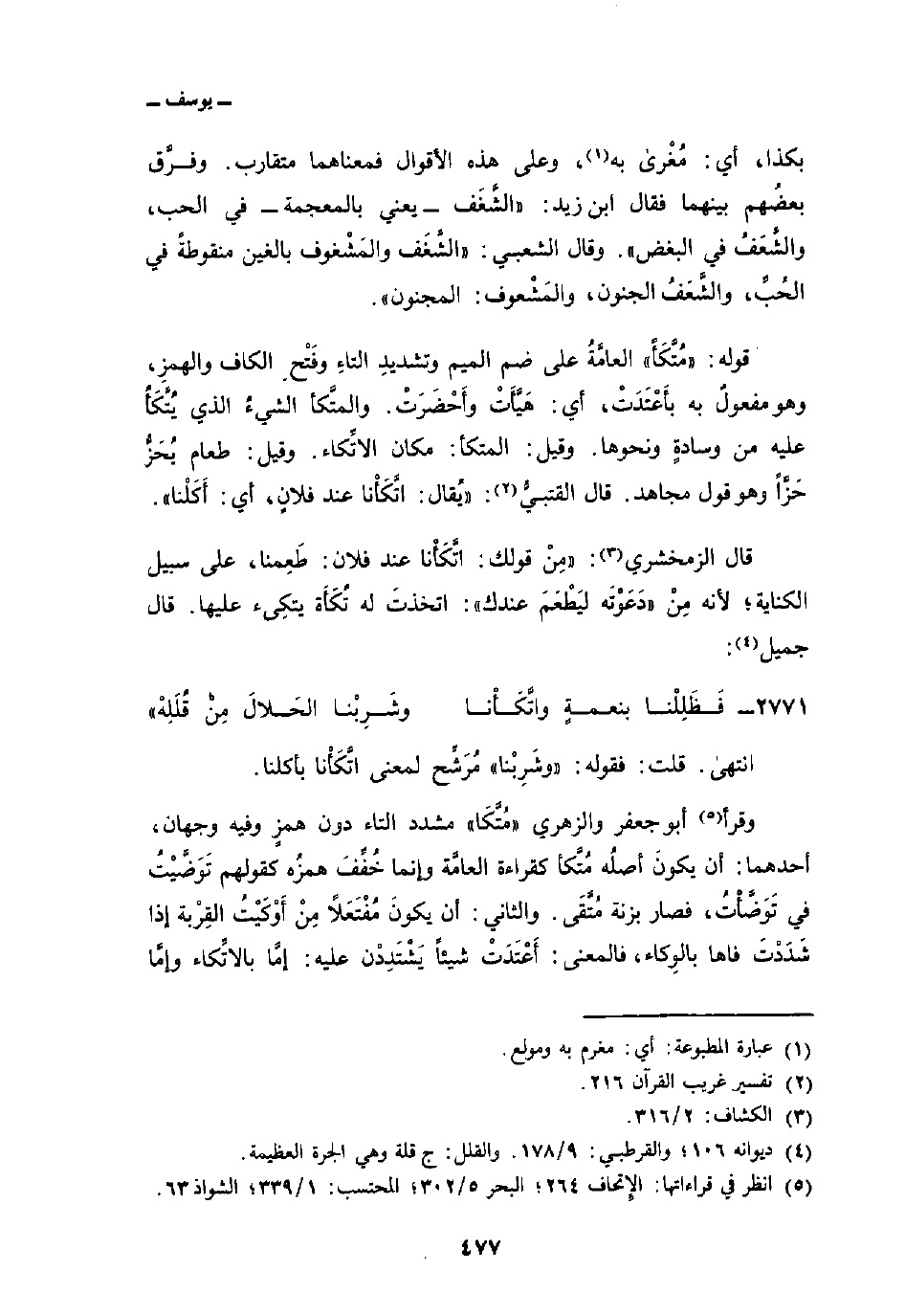 قال الزمخشري:» مِنْ قولك: اتَّكَأْنا عند فلان: طَعِمنا، على سبيل الكناية؛ لأنه مِنْ «دَعَوْتَه ليَطْعَمَ عندك» : اتخذتَ له تُكَأَة يتكِىء عليها. قال جميل: