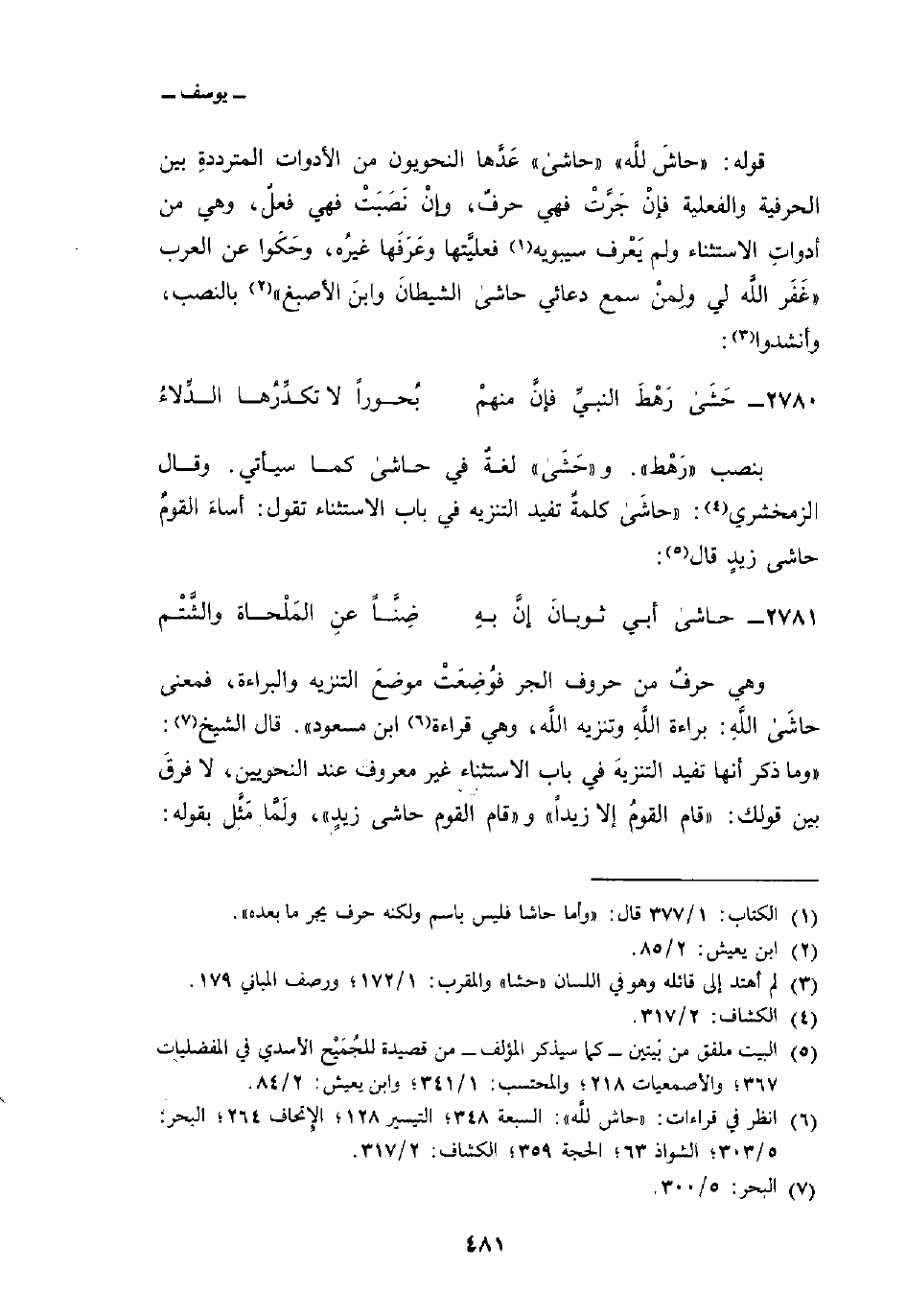وهي حرفٌ من حروف الجر فوُضِعَتْ موضعَ التنزيه والبراءة، فمعنى حاشى اللَّهِ: براءة اللَّهِ وتنزيه اللَّه، وهي قراءة ابن مسعود «. قال الشيخ:» وما ذكر أنها تفيد التنزيهَ في باب الاستثناء غير معروف عند النحويين، لا فرقَ بين قولك: «قام القومُ إلا زيداً» و «قام القوم حاشى زيدٍ» ، ولَمَّا مَثَّل بقوله: «