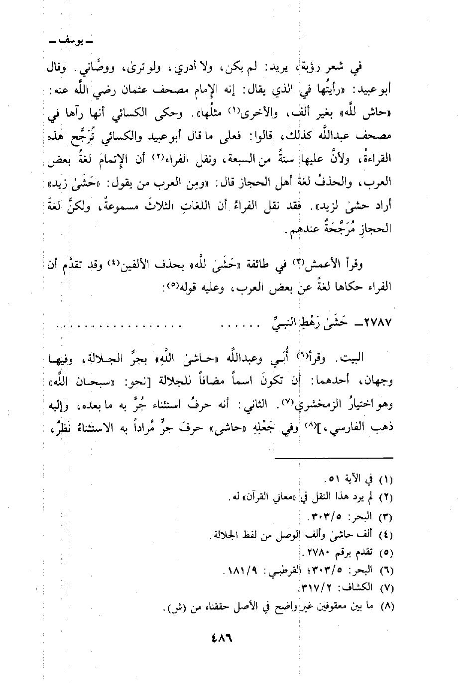 البيت. وقرأ أُبَي وعبد اللَّه «حاشى اللَّهِ» بجرِّ الجلالة، وفيها وجهان، أحدهما: أن تكونَ اسماً مضافاً للجلالة [نحو: «سبحان اللَّه» وهو اختيارُ الزمخشري. الثاني: أنه حرفُ استثناء جُرَّ به ما بعده، وإليه ذهب الفارسي،] وفي جَعْلِهِ «حاشى» حرفَ جرٍّ مُراداً به الاستثناءُ نظرٌ،