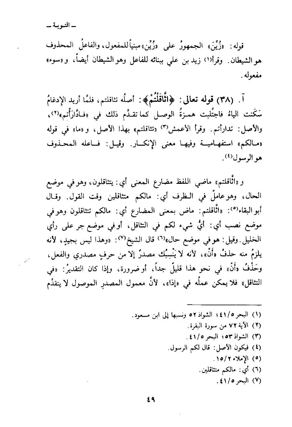 قوله تعالى: {اثاقلتم} : أصلُه تثاقلتم، فلمَّا أريد الإِدغامُ سَكَنت الياءُ فاجتُلبت همزةُ الوصل كما تقدَّم ذلك في {فادارأتم} [البقرة: 72] ، والأصل: تدارأتم. وقرأ الأعمش «تثاقلتم» بهذا الأصل، و «ما» في قوله «مالكم» استفهامية وفيها معنى الإِنكار. وقيل: فاعله المحذوف هو الرسول.