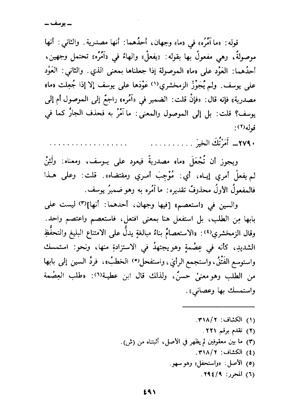 والسين في» استعصم « [فيها وجهان، أحدهما: أنها] ليست على بابها مِن الطلب، بل استفعل هنا بمعنى افتعل، فاستعصم واعتصم واحد. وقال الزمخشري:» الاستعصامُ بناءُ مبالغةٍ يدلُّ على الامتناع البليغ والتحفُّظِ الشديدِ، كأنه في عِصْمةٍ وهو يجتهدُ في الاستزادةِ منها، ونحو: استمسك واستوسع الفَتْقُ، استجمع الرأيَ، واستفحل الخطبُ «، فردَّ السين إلى بابها من الطلب وهو معنىً حسنٌ، ولذلك قال ابن عطية:» طلب العِصْمة واستمسك بها وعصاني «.