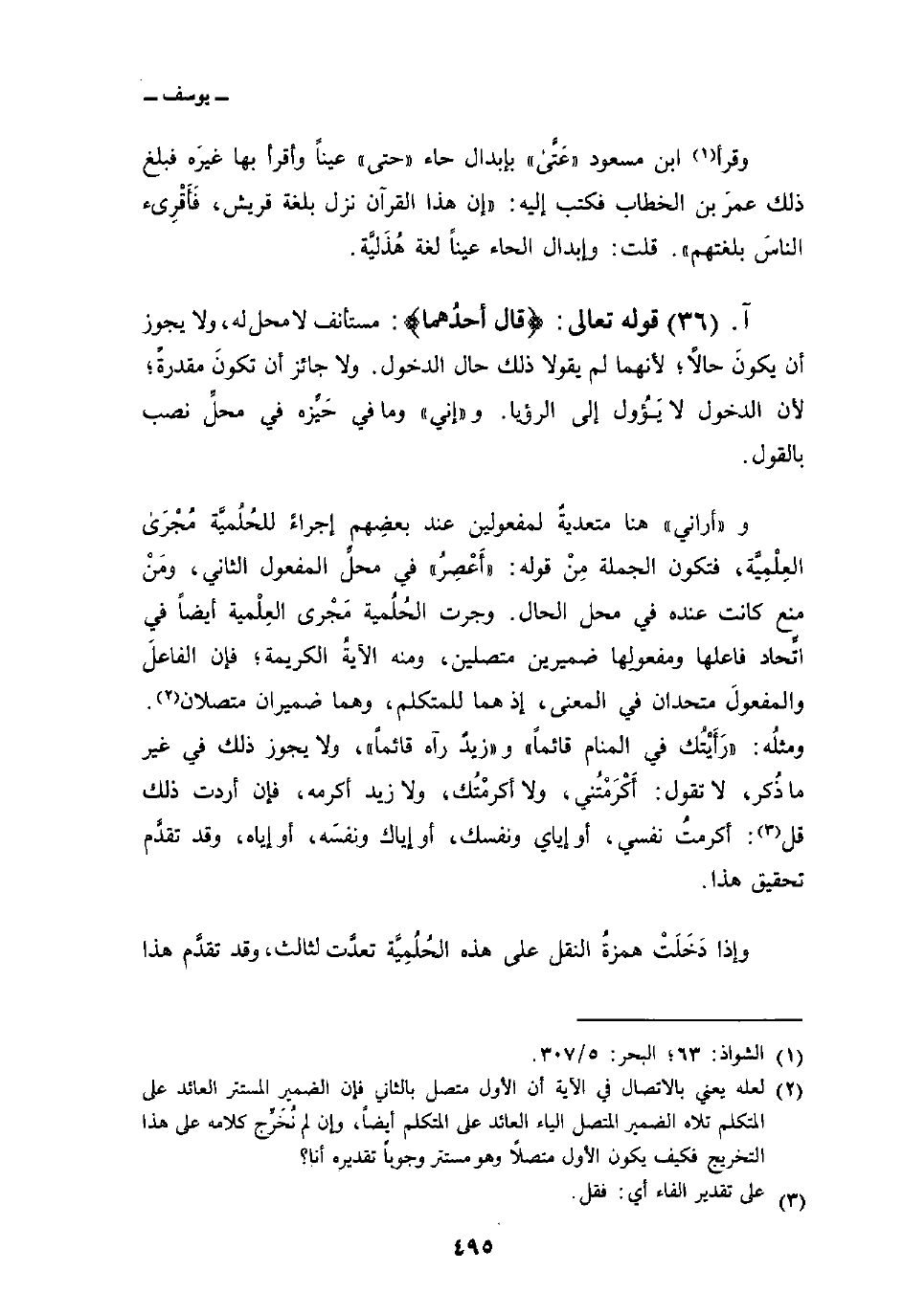 و «أراني» هنا متعديةٌ لمفعولين عند بعضِهم إجراءً للحُلُميَّة مجرى العِلْمِيَّة، فتكون الجملة مِنْ قوله: «أَعْصِرُ» في محلِّ المفعول الثاني، ومَنْ منع كانت عنده في محل الحال. وجرت الحُلُمية مَجْرى العِلْمية أيضاً في اتِّحاد فاعلها ومفعولِها ضميرين متصلين، ومنه الآيةُ الكريمة؛ فإن الفاعلَ والمفعولَ متحدان في المعنى؛ إذ هما للمتكلم، وهما ضميران متصلان. ومثلُه: «رَأَيْتُك في المنام قائماً» و «زيدٌ رآه قائماً» ، ولا يجوز ذلك في غير ما ذُكر، لا تقول: أَكْرَمْتُني، ولا أكرمْتُك، ولا زيد أكرمه، فإن أردت ذلك قل: أكرمتُ نفسي، أو إياي ونفسك، أو إياك ونفسَه، أو إياه، وقد تقدَّم تحقيق هذا.