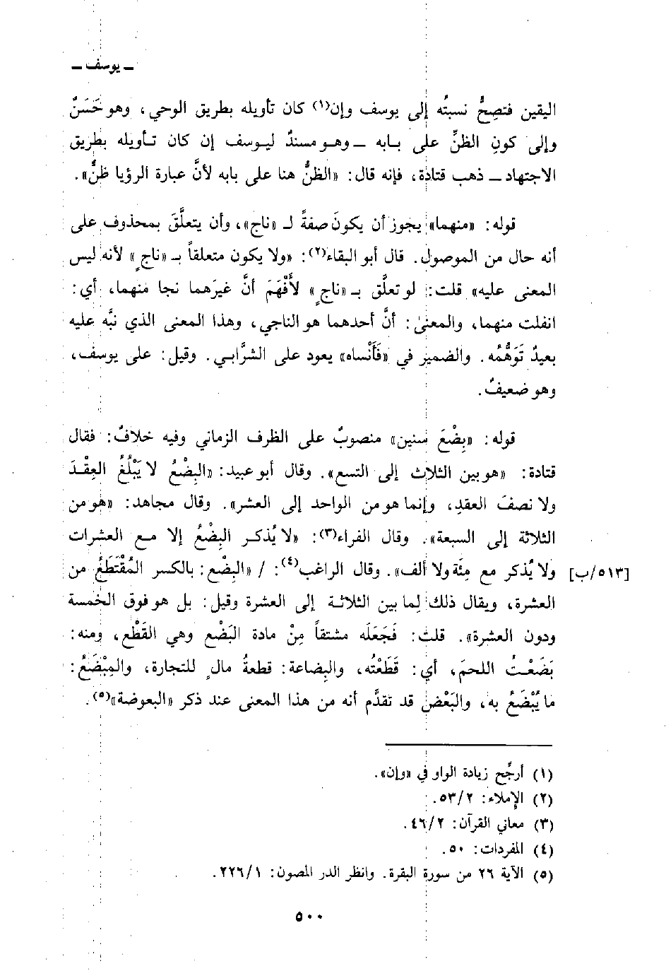اليقين فتصِحُّ نسبتُه إلى يوسف وإن كان تأويله بطريق الوحي، وهو حَسَنٌ وإلى كونِ الظنِّ على بابه وهو مسندٌ ليوسف إن كان تأويله بطريق الاجتهاد ذهب قتادة، فإنه قال: «الظنُّ هنا على بابه لأنَّ عبارة الرؤيا ظنٌّ» .