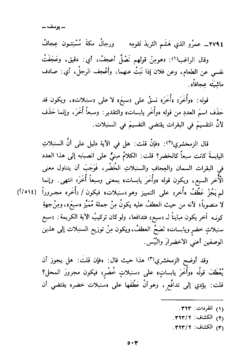 وقد أوضح الزمخشري هذا حيث قال:» فإن قلتَ: هل يجوز أن يُعْطَفَ قولُه «وأُخَرَ يابساتٍ» على «سنبلاتٍ خَضْرٍ» فيكون مجرورَ المحل؟ قلت: يؤدي إلى تدافُعٍ، وهو أنَّ عَطْفَها على «سنبلات خضر» يقتضي أن