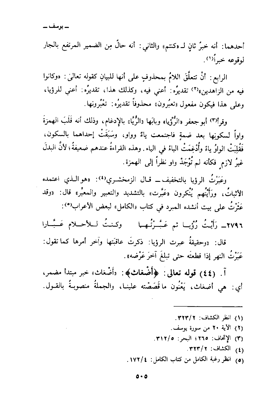 وعَبَرْتُ الرؤيا بالتخفيف قال الزمخشري: «هو الذي اعتمده الأثباتُ، ورَأَيْتُهم يُنْكرون» عَبَّرت «بالتشديد والتعبير والمعبِّر» قال: «وقد عَثَرْتُ على بيت أنشده المبرد في كتاب» الكامل «لبعض الأعراب:
