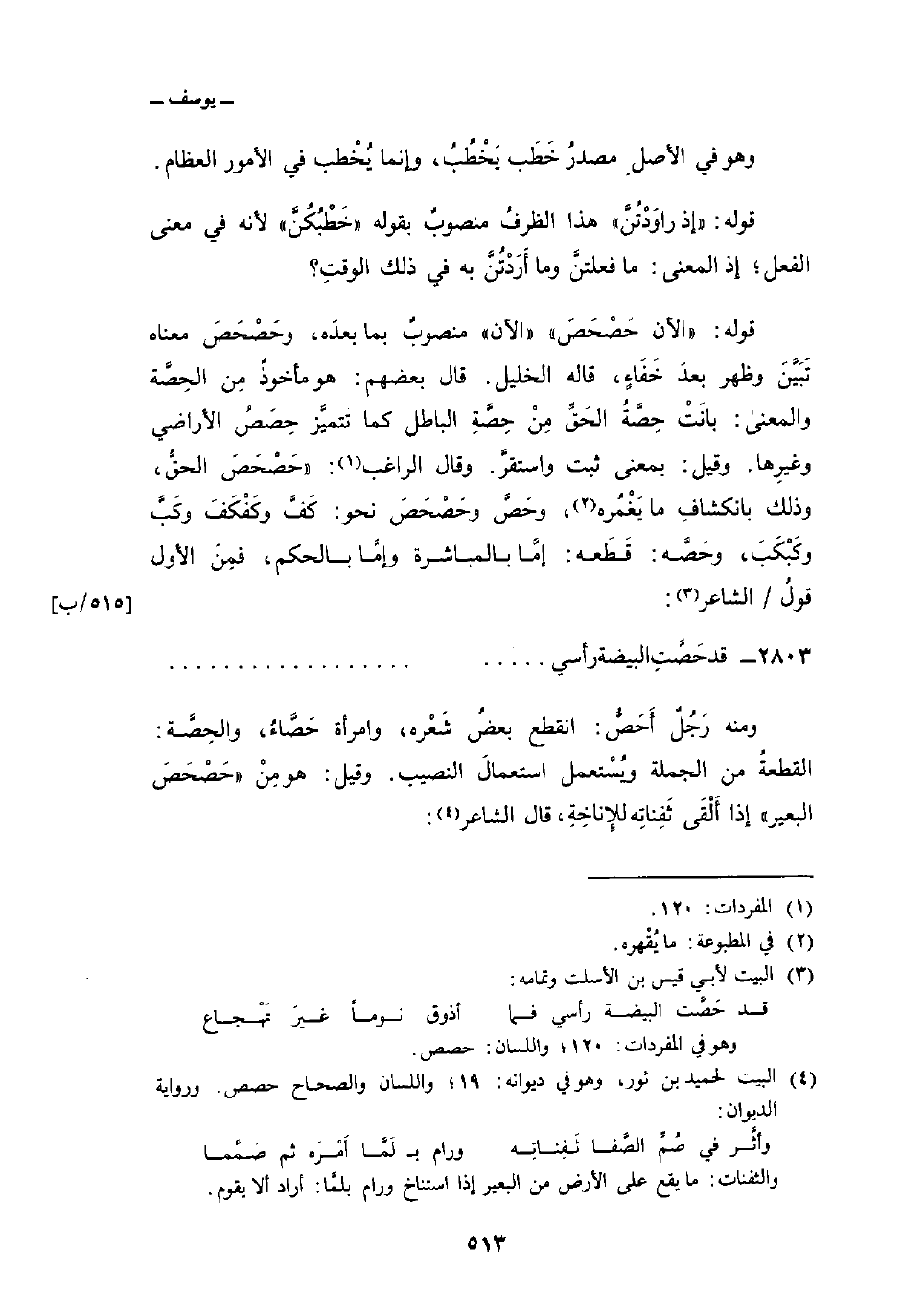 قوله: {الآن حَصْحَصَ} «الآن» منصوبٌ بما بعدَه، وحَصْحَصَ معناه تَبيَّنَ وظهر بعدَ خَفَاءٍ، قاله الخليل. قال بعضهم: هو مأخوذٌ مِن الحِصَّة والمعنى: بانَتْ حِصَّةُ الحَقِّ مِنْ حِصَّةِ الباطل كما تتميَّز حِصَصُ الأراضي وغيرِها. وقيل: بمعنى ثبت واستقرَّ. وقال الراغب: «حَصْحَصَ الحقُّ، وذلك بانكشافِ ما يَغْمُره، وحَصَّ وحَصْحَصَ نحو: كَفَّ وكَفْكَفَ وكَبَّ وكَبْكَبَ، وحَصَّه: قَطَعه: إمَّا بالمباشرة وإمَّا بالحكم، فمِنَ الأول قولُ/ الشاعر:
