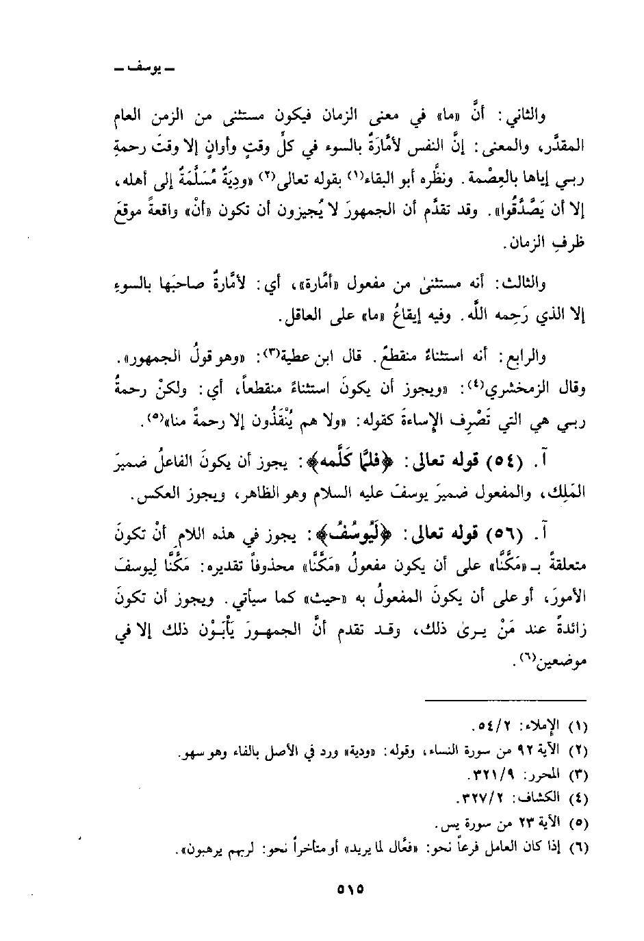 والثاني: أنَّ «ما» في معنى الزمان فيكون مستثنى من الزمن العام المقدَّر. والمعنى: إنَّ النفس لأمَّارَةٌ بالسوء في كلِّ وقتٍ وأوانٍ إلا وقتَ رحمةِ ربي إياها بالعِصْمة. ونظرَّه أبو البقاء بقوله تعالى: {وَدِيَةٌ مُّسَلَّمَةٌ إلى أَهْلِهِ إِلاَّ أَن يَصَّدَّقُواْ} [النساء: 92] . وقد تقدَّم أن الجمهورَ لا يُجيزون أن تكون «أنْ» واقعةً موقعَ ظرفِ الزمان.