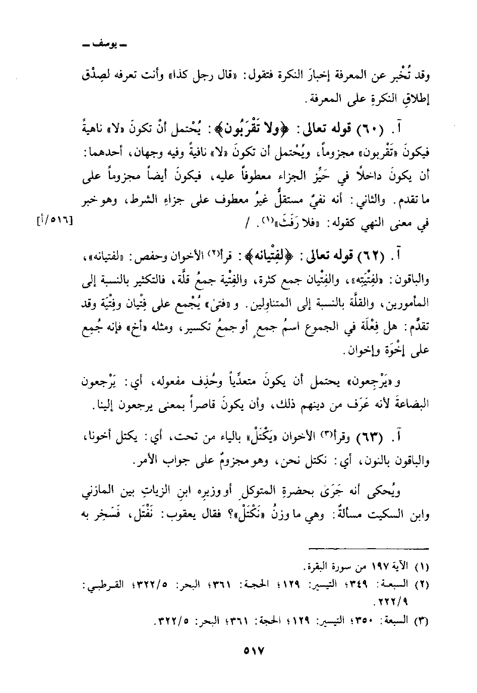 قوله تعالى: {وَلاَ تَقْرَبُونِ} : يُحْتمل أنْ تكونَ «لا» ناهيةً فيكونَ «تَقْربون» مجزوماً، ويُحْتمل أن تكونَ «لا» نافيةً وفيه وجهان، أحدهما: أن يكونَ داخلاً في حَيِّز الجزاء معطوفاً عليه، فيكونَ أيضاً مجزوماً على ما تقدم. والثاني: أنه نفيٌّ مستقلٌّ غيرُ معطوف على جزاءِ الشرط، وهو خبر في معنى النهي كقوله: {فَلاَ رَفَثَ} [البقرة: 197] . /