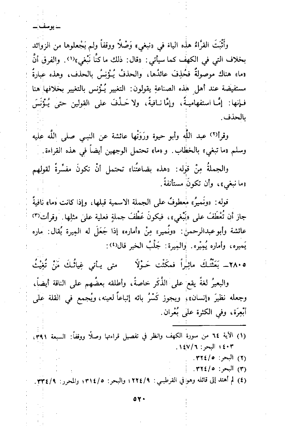 وأَثْبَتَ القرَّاءُ هذه الياءَ في «نبغي» وَصْلاً ووقفاً ولم يَجْعلوها من الزوائد بخلاف التي في الكهف كما سيأتي: {قَالَ ذَلِكَ مَا كُنَّا نَبْغِ} [الكهف: 64] . والفرق أنَّ «ما» هناك موصولةٌ فحُذِفَ عائدُها، والحذفُ يُؤْنِسُ بالحذف، وهذه عبارة مستفيضة عند أهلِ هذه الصناعةِ يقولون: التغيير يُؤْنس بالتغيير بخلافها هنا فإنها: إمَّا استفهاميةٌ، وإمَّا نافيةٌ، ولا حَذْفَ على القولين حتى يُؤْنَسَ بالحذف.