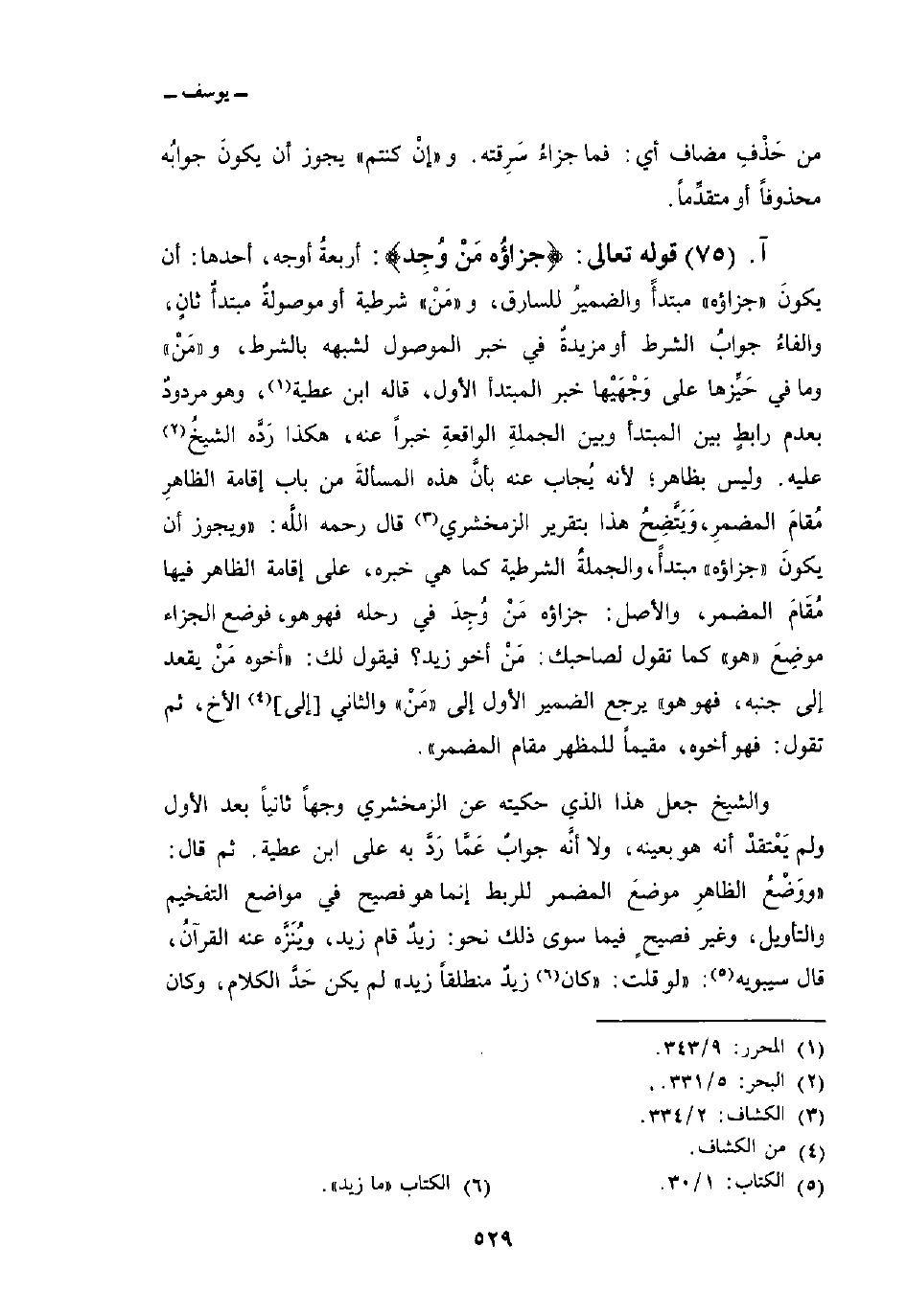 قوله تعالى: {جَزَآؤُهُ مَن وُجِدَ} : أربعةُ أوجه، أحدها: أن يكونَ «جزاؤه» مبتدأً والضميرُ للسارق، و «مَنْ» شرطية أو موصولةٌ مبتدأٌ ثانٍ، والفاءُ جوابُ الشرط أو مزيدةٌ في خبر الموصول لشبهه بالشرط، و «مَنْ» وما في حَيِّزها على وَجْهَيْها خبر المبتدأ الأول، قاله ابن عطية، وهو مردودٌ بعدم رابطٍ بين المبتدأ وبين الجملةِ الواقعةِ خبراً عنه، هكذا رَدَّه الشيخُ عليه. وليس بظاهر؛ لأنه يُجاب عنه بأنَّ هذه المسألةَ من باب إقامة الظاهرِ مُقامَ المضمرِ، وَيَتَّضِحُ هذا بتقرير الزمخشري قال رحمه اللَّه: «ويجوز أن يكونَ» جزاؤه «مبتدأً، والجملةُ الشرطية كما هي خبره، على إقامة الظاهر فيها مُقَامَ المضمر. والأصل: جزاؤه مَنْ وُجِدَ في رحله فهو هو، فوضع الجزاء موضِعَ» هو «كما تقول لصاحبك: مَنْ أخو زيد؟ فيقول لك:» أخوه مَنْ يقعد إلى جنبه، فهو هو «يرجع الضمير الأول إلى» مَنْ «والثاني [إلى] الأخ، ثم تقول: فهو أخوه، مقيماً للمظهر مقام المضمر» .
