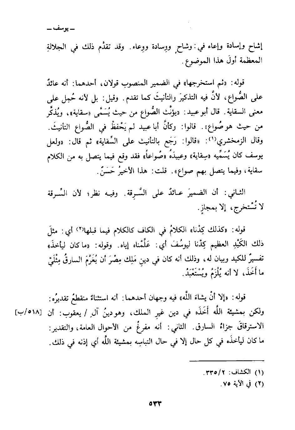 قوله: {ثُمَّ استخرجها} في الضمير المنصوب قولان، أحدهما: أنه عائدٌ على الصُّواع، لأنَّ فيه التذكيرَ والتأنيثَ كما تقدم. وقيل: بل لأنه حُمِل على معنى السقاية. وقال أبو عبيد: «يؤنَّث الصُّواع من حيث يُسَمَّى» سقاية «، ويُذكَّر من حيث هو صُواع» . قالوا: وكأنَّ أبا عبيد لم يَحْفظْ في الصُّواع التأنيثَ. وقال الزمخشري: «قالوا: رَجَع بالتأنيث على السِّقاية» ثم قال: «ولعل يوسف كان يُسَمِّيه» سِقاية «وعبيدَهُ» صُواعاً «فقد وقع فيما يتصل به من الكلام سقاية، وفيما يتصل بهم صواع» . قلت: هذا الأخيرُ حَسَنٌ.