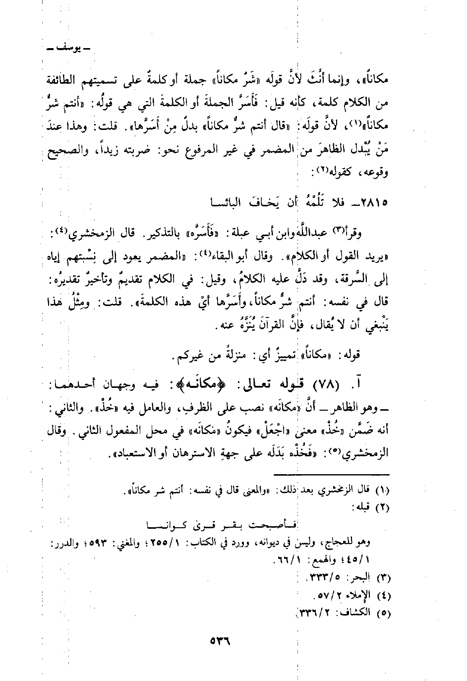 2815 - فلا تَلُمْهُ أن يَخافَ البائسا ... وقرأ عبد اللَّه وابن أبي عبلة: «فَأَسَرَّه» بالتذكير. قال الزمخشري: «يريد القول أو الكلام» . وقال أبو البقاء: «المضمر يعود إلى نِسْبتهم إياه إلى السَّرقة، وقد دَلَّ عليه الكلامُ، وقيل: في الكلام تقديمٌ وتأخيرٌ تقديرهُ: قال في نفسه: أنتم شرٌّ مكاناً، وأَسَرَّها أيْ هذه الكلمةَ» . قلت: ومِثْلُ هذا يَنْبغي أن لا يُقال: فإنَّ القرآنَ يُنَزَّهُ عنه.