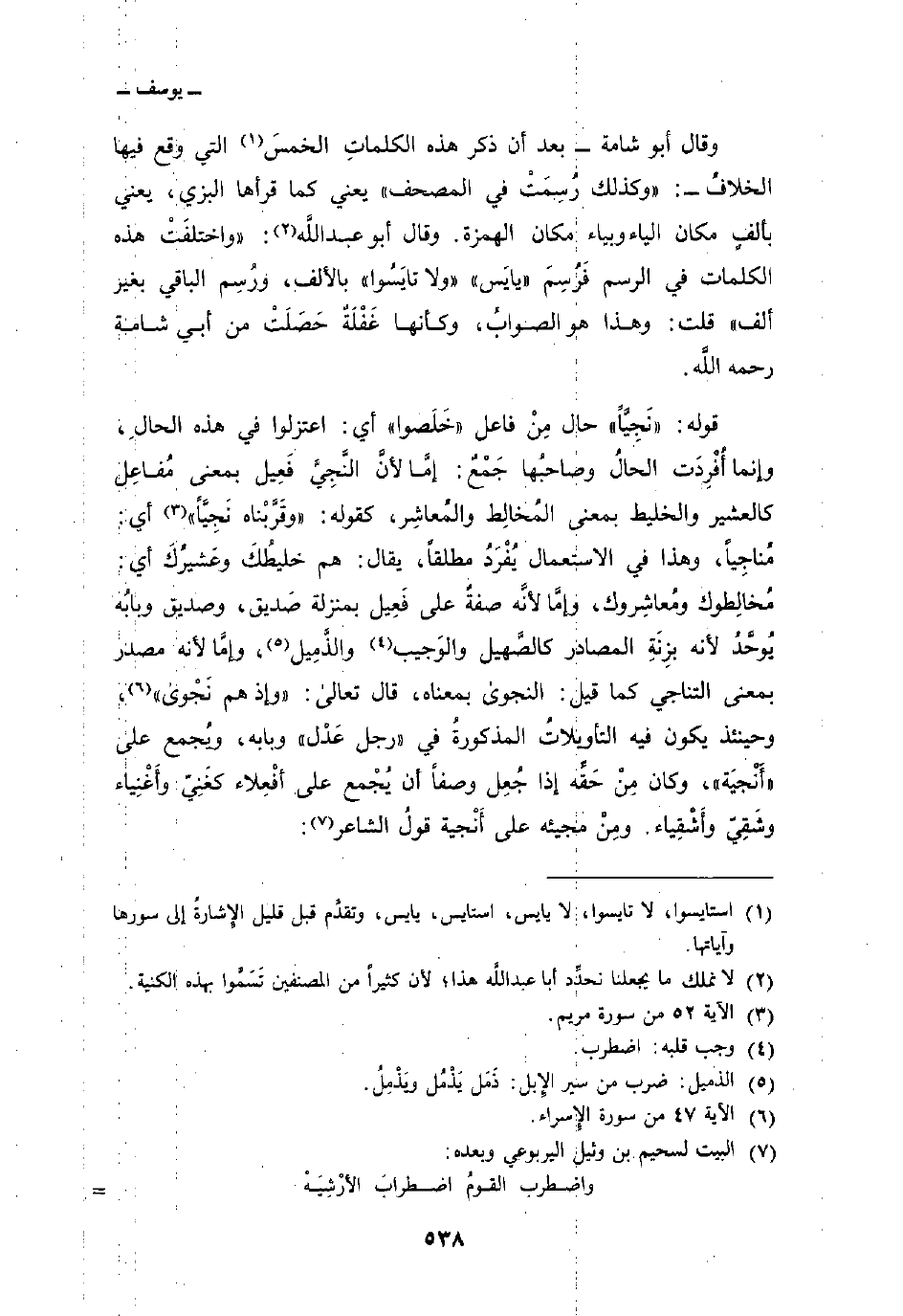 وقال أبو شامة بعد أن ذكر هذه الكلماتِ الخمسَ التي وقع فيها الخلافُ:» وكذلك رُسِمَتْ في المصحف «يعني كما قرأها البزي، يعني بألفٍ مكان الياء وبياء مكان الهمزة. وقال أبو عبد اللَّه:» واختلفَتْ هذه الكلمات في الرسم فَرُسِمَ «يابَس» «ولا تايَسُوا» بالألف، ورُسِم الباقي بغير ألف «قلت: وهذا هو الصوابُ، وكأنها غَفْلَةٌ حَصَلَتْ من أبي شامة رحمه اللَّه.
