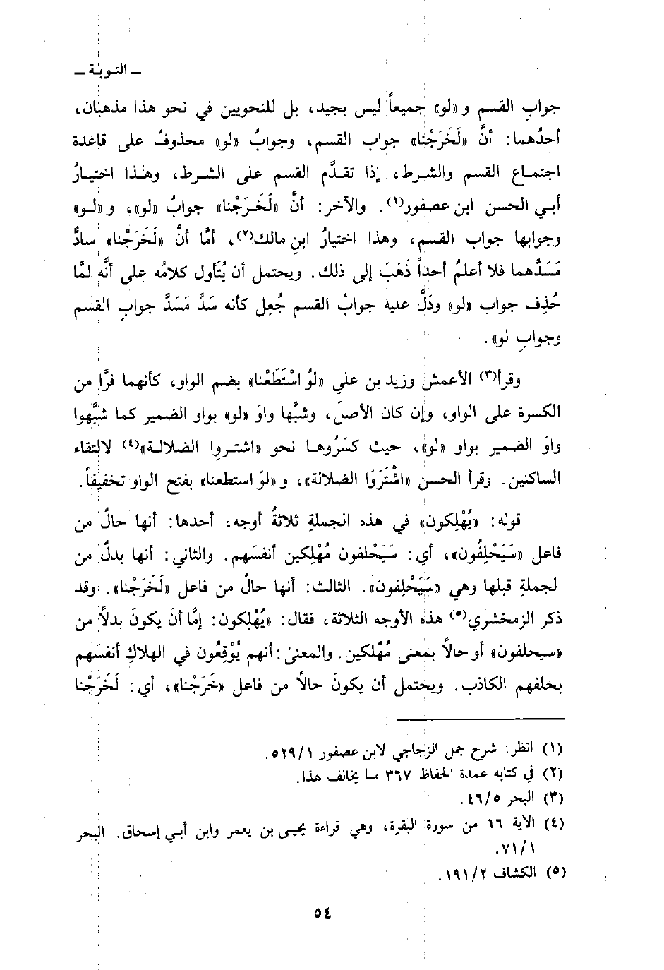 جوابِ القسم و «لو» جميعاً ليس بجيد، بل للنحويين في نحو هذا مذهبان، أحدُهما: أنَّ «لَخَرَجْنا» جواب القسم، وجوابُ «لو» محذوفٌ على قاعدة اجتماع القسم والشرط، إذ تقدَّم القسم على الشرط، وهذا اختيارٌ أبي الحسن ابن عصفور. والآخر: أنَّ «لَخَرَجْنا» جوابُ «لو» ، و «لو» وجوابها جواب القسم، وهذا اختيارُ ابنِ مالك، أمَّا أنَّ «لَخَرَجْنا» سادٌّ مَسَدَّهما فلا أعلمُ أحداً ذَهَبَ إلى ذلك. ويحتمل أن يُتَأول كلامُه على أنَّه لمَّا حُذِف جواب «لو» ودَلَّ عليه جوابُ القسم جُعِل كأنه سَدَّ مَسَدَّ جوابِ القسم وجوابِ لو «.