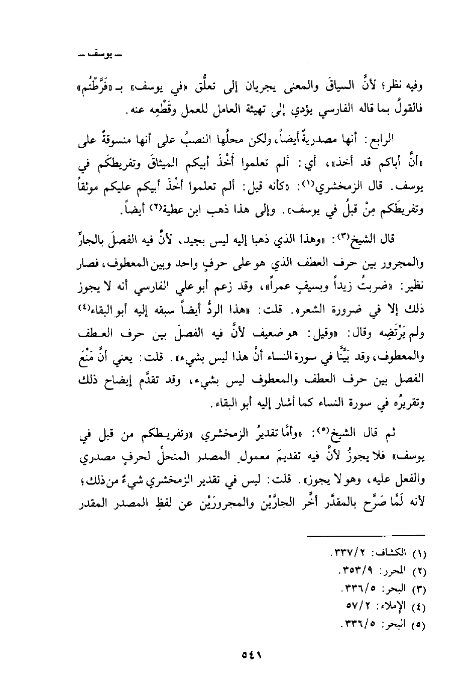 ثم قال الشيخ:» وأمَّا تقديرُ الزمخشري «وتفريطكم من قبل في يوسف» فلا يجوزُ لأنَّ فيه تقديمَ معمولِ المصدر المنحلِّ لحرفٍ مصدري والفعل عليه، وهو لا يجوز «. قلت: ليس في تقدير الزمخشري شيءٌ من ذلك؛ لأنه لَمَّا صَرَّح بالمقدَّر أخَّر الجارَّيْن والمجرورَيْن عن لفظِ المصدر المقدر