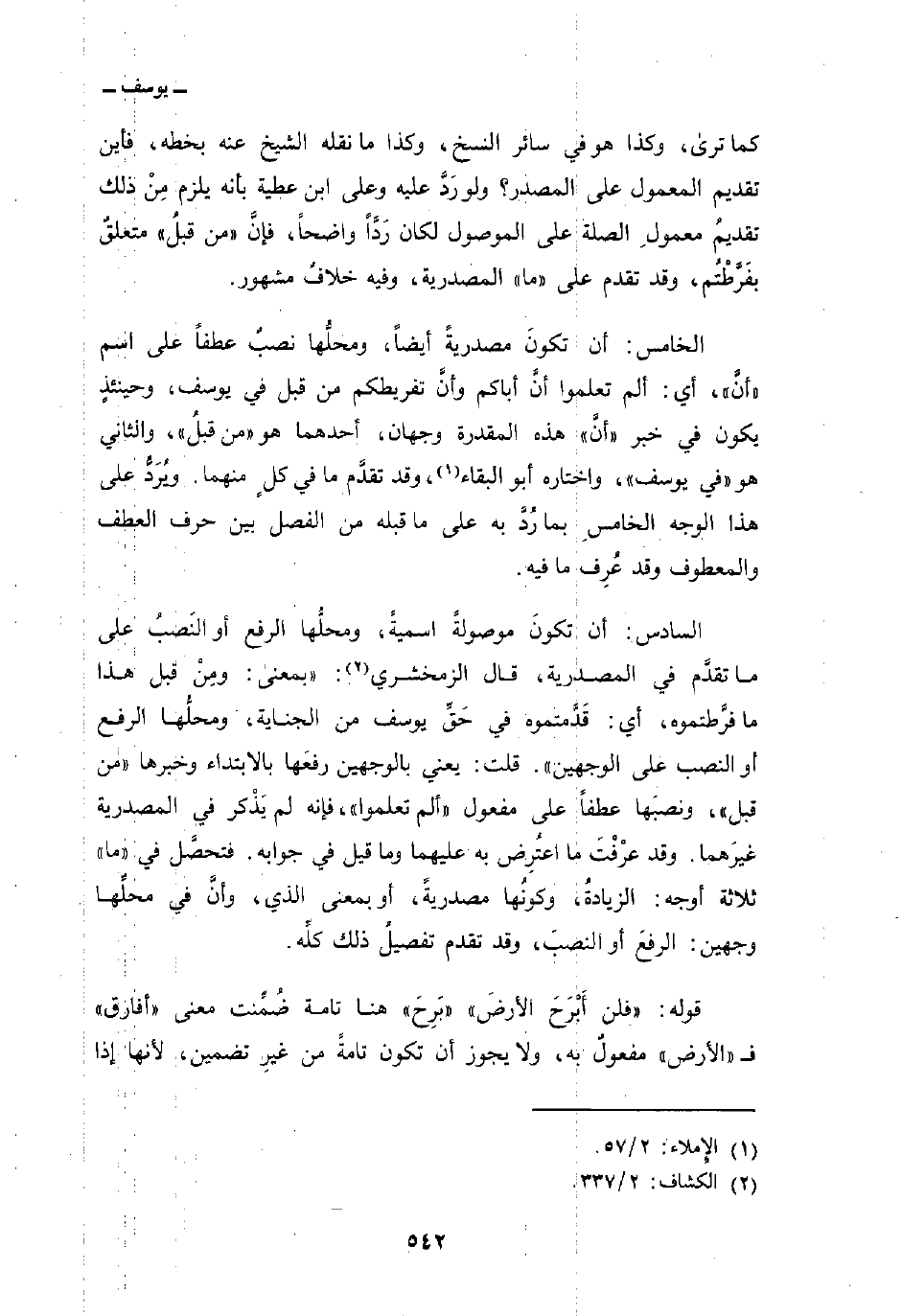 الخامس: أن تكونَ مصدريةً أيضاً، ومحلُّها نصبٌ عطفاً على اسم» أنَّ «، أي: ألم تعلموا أنَّ أباكم وأنَّ تفريطكم من قبل في يوسف، وحينئذٍ يكون في خبر» أنَّ «هذه المقدرة وجهان، أحدهما وهو» من قبلُ «، والثاني هو» في يوسف «، واختاره أبو البقاء، وقد تقدَّم ما في كلٍ منهما. ويُرَدُّ على هذا الوجه الخامسِ بما رُدَّ به على ما قبله من الفصل بين حرف العطف والمعطوف وقد عُرِف ما فيه.