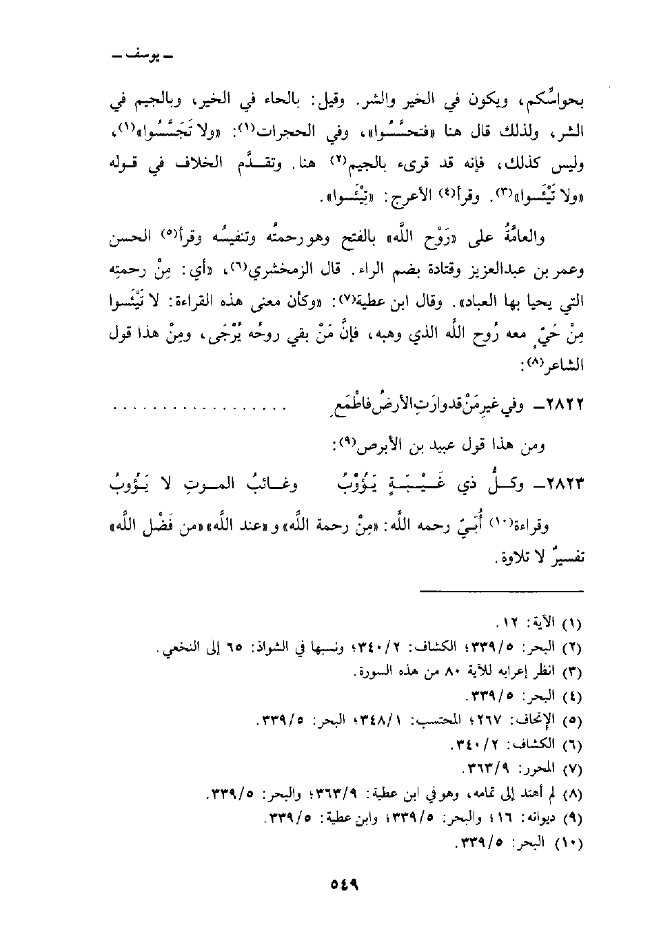 بحواسِّكم، ويكون في الخير والشر. وقيل: بالحاء في الخير، وبالجيم في الشر، ولذلك قال هنا «فتحسَّسُوا» ، وفي الحجرات: {وَلاَ تَجَسَّسُواْ} [الآية: 12] ، وليس كذلك، فإنه قد قرىء بالجيم هنا. وتقدَّم الخلاف في قوله «وَلاَ تَيْأَسُواْ» . وقرأ الأعرج: «تَيْئَسوا» .