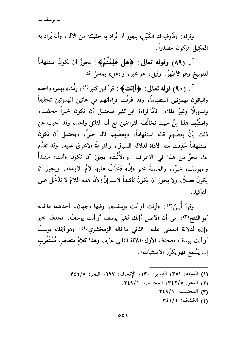 وقرأ أُبَيّ:» أإنك أو أنت يوسف «، وفيها وجهان، أحدهما ما قاله أبو الفتح: من أن الأصل أإنك لغيرُ يوسف أو أنت يوسفُ، فحذف خبر» إن «لدلالة المعنى عليه. الثاني ما قاله الزمخشري: وهو إنك يوسفُ أو أنت يوسف» فحذف الأول لدلالة الثاني عليه، وهذا كلامُ متعجبٍ مُسْتَغْرِبٍ لِما يَسْمع فهو يكرِّر الاستثباتَ «.