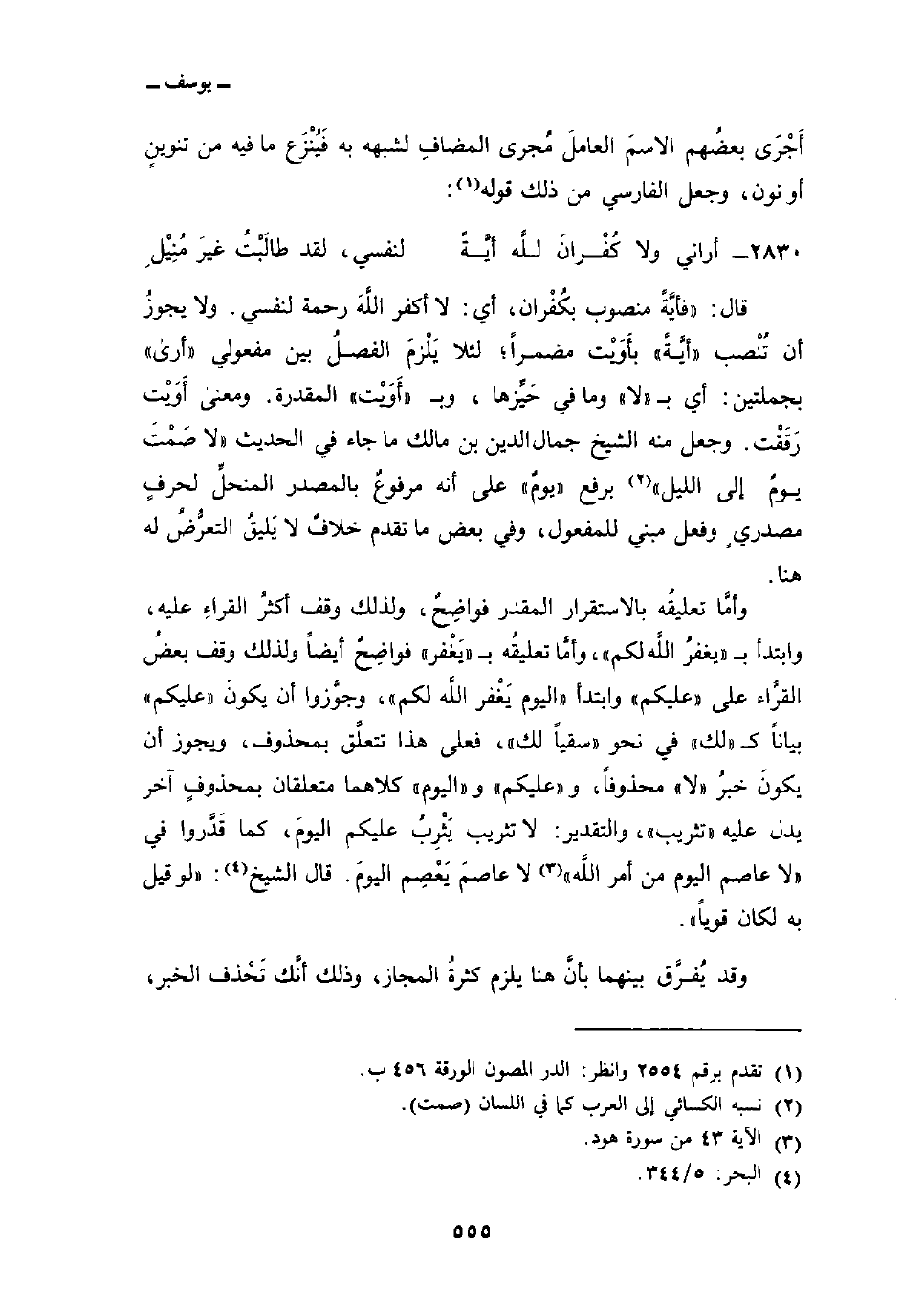 قال:» فأيَّةً منصوب بكُفْران، أي: لا أكفر اللَّهَ رحمة لنفسي. ولا يجوزُ أن تُنْصب «أيَّةً» بأَوَيْت مضمراً؛ لئلا يَلْزمَ الفصلُ بين مفعولي «أرى» بجملتين: أي ب «لا» وما في حَيِّزها، وب «أَوَيْت» المقدرة. ومعنى أَوَيْت رَقَقْت. وجعل منه الشيخ جمال الدين بن مالك ما جاء في الحديث «لا صَمْتَ يومٌ إلى الليل» برفع «يومٌ» على أنه مرفوعٌ بالمصدر المنحلِّ لحرفٍ مصدري وفعل مبني للمفعول، وفي بعض ما تقدم خلافٌ لا يَليقُ التعرُّضُ له هنا.