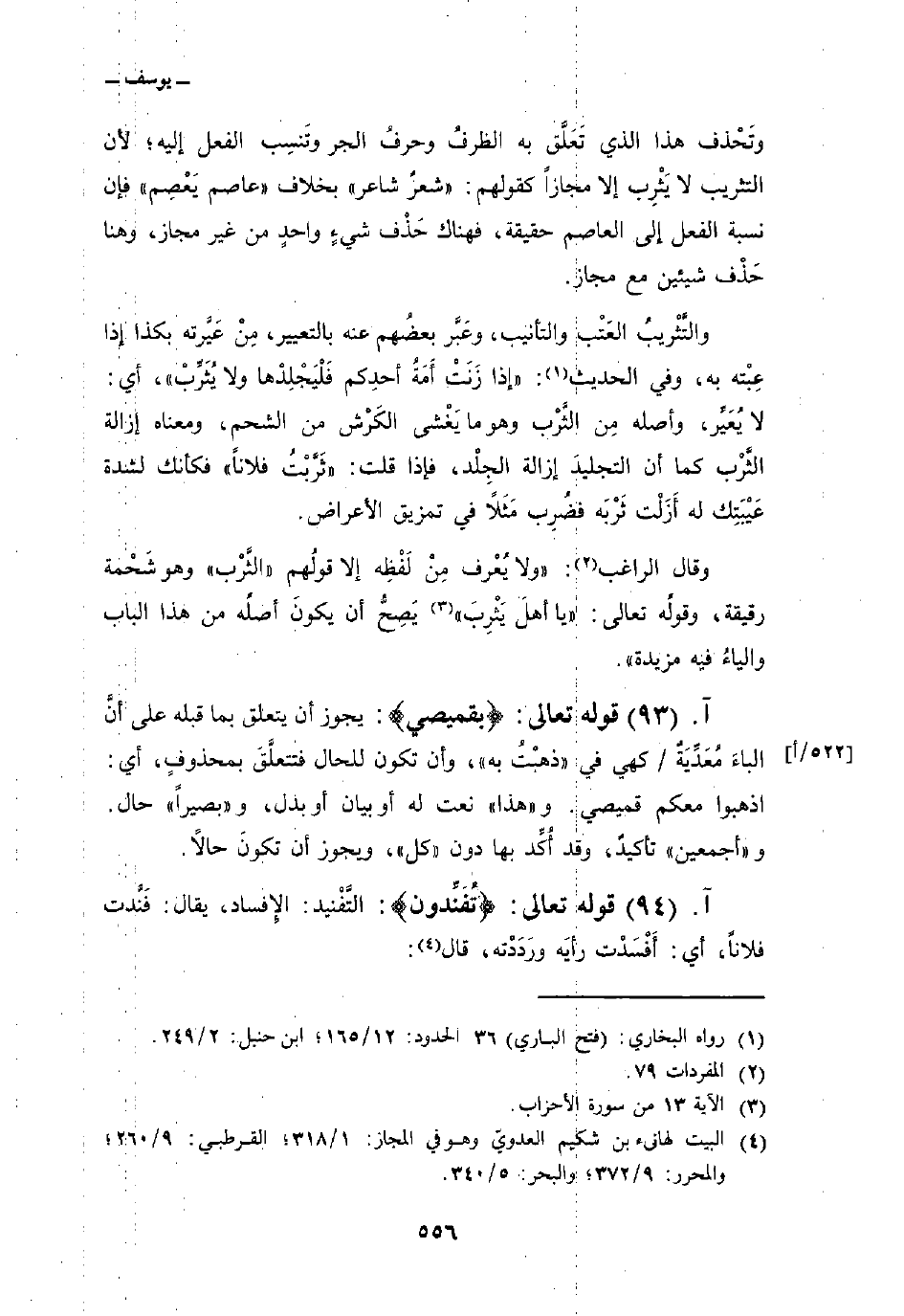 وتَحْذف هذا الذي تَعَلَّق به الظرفُ وحرفُ الجر وتَنسِب الفعل إليه؛ لأن التثريب لا يَثْرِب إلا مجازاً كقولهم: «شعرٌ شاعر» بخلاف «عاصم يَعْصِم» فإن نسبة الفعل إلى العاصم حقيقة، فهناك حَذْف شيءٍ واحدٍ من غير مجاز، وهنا حَذْف شيئين مع مجاز.