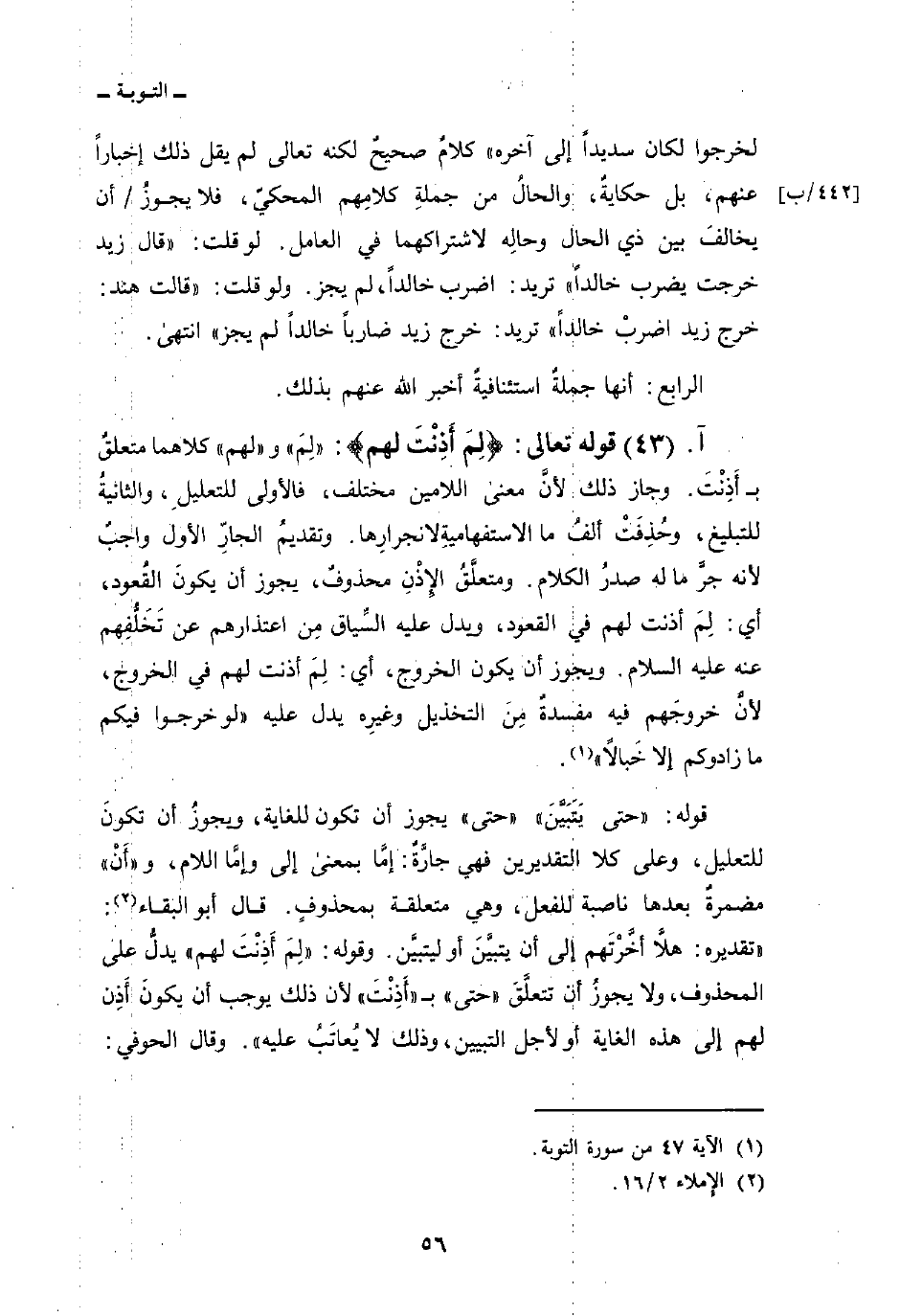 قوله: {حتى يَتَبَيَّنَ} «حتى» يجوز أن تكون للغاية، ويجوزُ أن تكونَ للتعليل، وعلى كلا التقديرين فهي جارَّةٌ: إمَّا بمعنى إلى وإمَّا اللام، و «أَنْ» مضمرةٌ بعدها ناصبة للفعل، وهي متعلقة بمحذوفٍ. قال أبو البقاء «تقديره: هلاَّ أخَّرْتَهم إلى أن يتبيَّنَ أو ليتبيَّن. وقوله: {لِمَ أَذِنتَ لَهُمْ} يدلُّ على المحذوف، ولا يجوزُ أن تتعلَّقَ» حتى «ب» أَذِنْتَ «لأن ذلك يوجب أن يكونَ أَذِن لهم إلى هذه الغاية أو لأجل التبيين، وذلك لا يُعاتَبُ عليه» . وقال الحوفي «