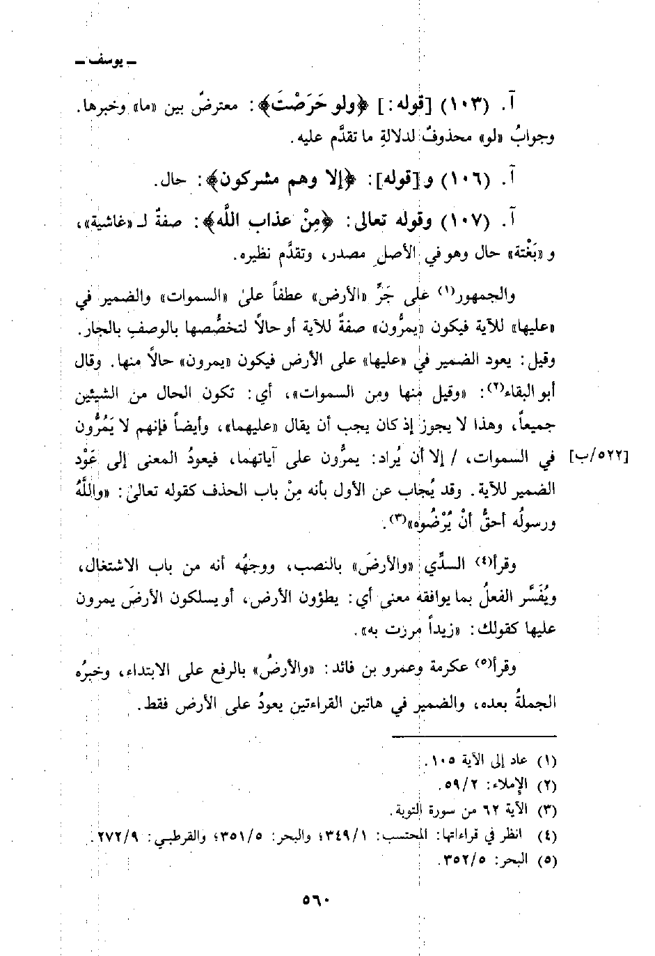 والجمهور على جَرِّ «الأرض» عطفاً على «السماوات» والضمير في «عليها» للآية فيكون «يمرُّون» صفة للآية أو حالاً لتخصُّصها بالوصفِ بالجار. وقيل: يعود الضمير في «عليها» على الأرض فيكون «يمرون» حالاً منها. وقال أبو البقاء: «وقيل منها ومن السماوات» ، أي: تكون الحال من الشيئين جميعاً، وهذا لا يجوز إذ كان يجب أن يقال «عليهما» ، وأيضاً فإنهم لا يَمُرُّون في السماوات، / إلا أن يُراد: يمرُّون على آياتهما، فيعودُ المعنى إلى عَوْد الضمير للآية. وقد يُجاب عن الأول بأنه مِنْ باب الحذف كقوله تعالى: {والله وَرَسُولُهُ أَحَقُّ أَن يُرْضُوهُ} [التوبة: 62] .