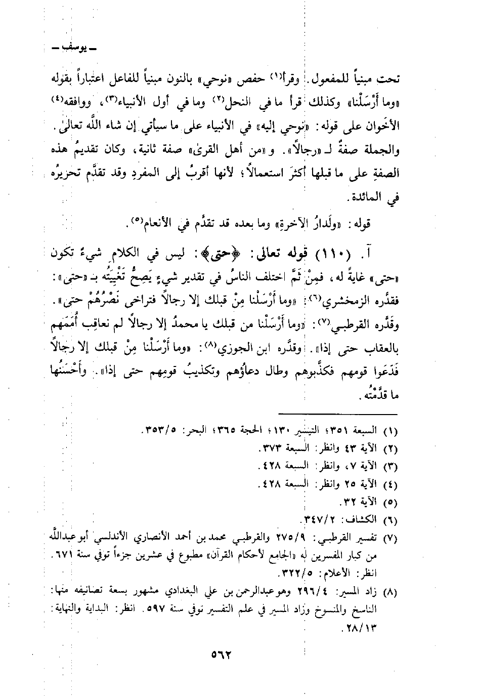 قوله تعالى: {حتى} : ليس في الكلامِ شيءٌ تكون «حتى» غايةً له، فمِنْ ثَمَّ اختلف الناسُ في تقدير شيءٍ يَصِحُّ تَغْيِيَتُه ب «حتى» : فقدَّره الزمخشري: «وما أَرْسَلْنا مِنْ قبلك إلا رجالاً فتراخى نَصْرُهُمْ حتى» . وقَدَّره القرطبي: «وما أَرْسَلْنا من قبلك يا محمدُ إلا رجالاً لم نعاقِب أُمَمَهم بالعقاب حتى إذا» . وقدَّره ابن الجوزي: «وما أَرْسَلْنا مِنْ قبلك إلا رجالاً فَدَعَوا قومهم فكذَّبوهم وطال دعاؤُهم وتكذيبُ قومِهم حتى إذا» . وأَحْسَنُها ما قدَّمْتُه.