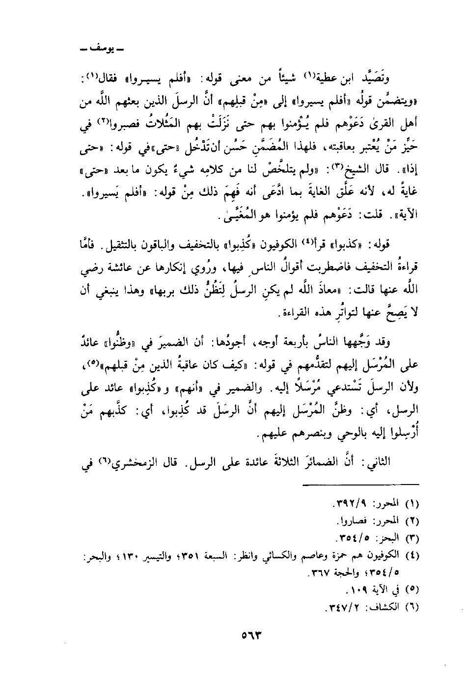 وقد وَجَّهها الناسُ بأربعة أوجه، أجودُها: أن الضميرَ في» وظنُّوا «عائدٌ على المُرْسَل إليهم لتقدُّمهم في قوله: {كَيْفَ كَانَ عَاقِبَةُ الذين مِن قَبْلِهِمْ} [يوسف: 109] ، ولأن الرسلَ تَسْتدعي مُرْسَلاً إليه. والضمير في» أنهم «و» كُذِبوا «عائد على الرسل، أي: وظنَّ المُرْسَل إليهم أنَّ الرسَلَ قد كُذِبوا، أي: كذَّبهم مَنْ أُرْسِلوا إليه بالوحي وبنصرهم عليهم.