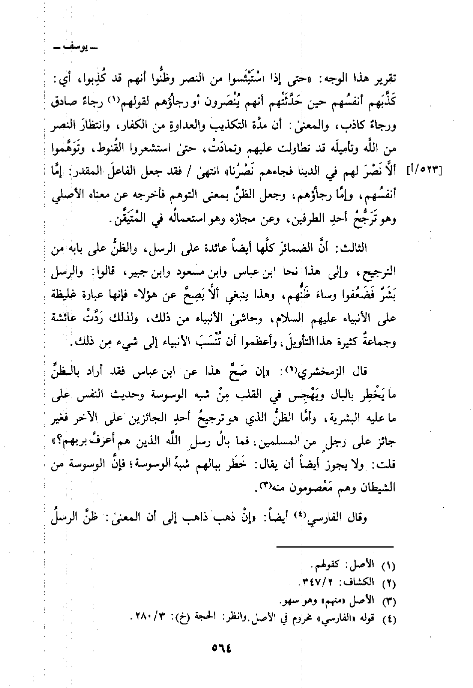 وقال الفارسي أيضا: «إنْ ذهب ذاهب إلى أن المعنى: ظنَّ الرسلُ