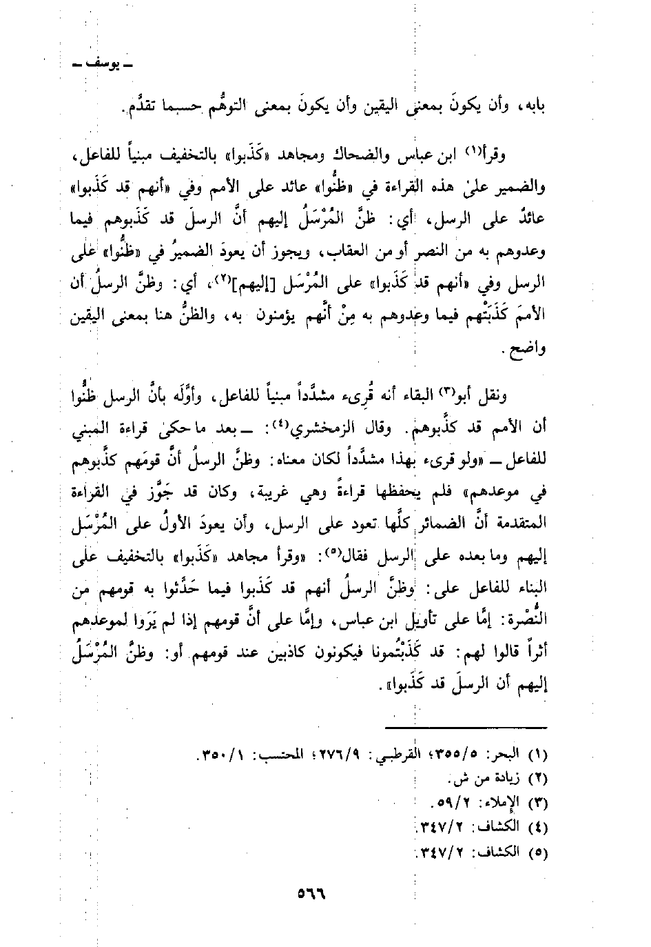 وقرأ ابن عباس والضحاك ومجاهد «كَذَبوا» بالتخفيف مبنياً للفاعل، والضمير على هذه القراءة في «ظنُّوا» عائد على الأمم وفي {أَنَّهُمْ قَدْ كُذِبُواْ} عائدٌ على الرسل، أي: ظنَّ المُرْسَلُ إليهم أنَّ الرسلَ قد كَذَبوهم فيما وعدوهم به من النصر أو من العقاب، ويجوز أن يعودَ الضميرُ في «ظنُّوا» على الرسل وفي {أَنَّهُمْ قَدْ كُذِبُواْ} على المُرْسَل [إليهم] ، أي: وظنَّ الرسلُ أن الأممَ كَذَبَتْهم فيما وعدوهم به مِنْ أنَّهم يؤمنون به، والظنُّ هنا بمعنى اليقين واضح.