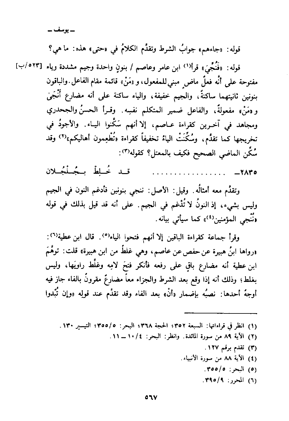 وتقدَّم معه أمثالُه. وقيل: الأصل: ننجي بنونين فأدغم النون في الجيم وليس بشيء، إذ النونُ لا تُدْغم في الجيم. على أنه قد قيل بذلك في قوله {نُنجِي المؤمنين} [الأنبياء: 88] كما سيأتي بيانه.