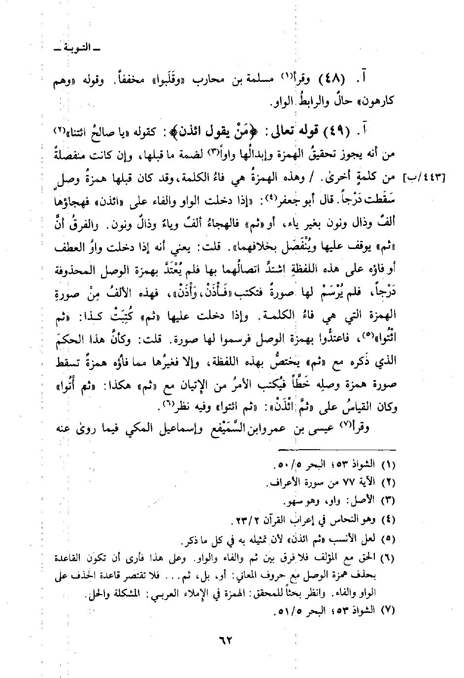 قوله تعالى: {مَّن يَقُولُ ائذن} : كقوله {يَاصَالِحُ ائتنا} [الأعراف: 77] من أنه يجوز تحقيقُ الهمزة وإبدالُها واواً لضمة ما قبلها، وإن كانت منفصلةُ من كلمةٍ أخرى. / وهذه الهمزةُ هي فاءُ الكلمة، وقد كان قبلها همزةُ وصل سَقَطت دَرْجاً. قال أبو جعفر. «إذا دخلت الواو والفاء على» ائذن «فهجاؤها ألفٌ وذال ونون بغير ياء، أو» ثم «فالهجاءُ ألفٌ وياءٌ وذالٌ ونون. والفرقُ أنَّ» ثم «يوقف عليها ويُنْفَصَل بخلافهما» . قلت: يعني أنه إذا دخلت واوُ العطف أو فاؤه على هذه اللفظةِ اشتدَّ اتصالُهما بها فلم يُعْتَدَّ بهمزة الوصل المحذوفة دَرْجاً، فلم يُرْسَمْ لها صورةٌ فتكتب «فَأْذَنْ، وَأْذَنْ» ، فهذه الألفُ مِنْ صورةِ الهمزة التي هي فاءُ الكلمة. وإذا دخلت عليها «ثم» كُتِبَتْ كذا: {ثُمَّ ائتوا} ، فاعتدُّوا بهمزة الوصل فرسموا لها صورة. قلت: وكأنَّ هذا الحكمَ الذي ذَكره مع «ثم» يختصُّ بهذه اللفظة، وإلا فغيرُها مما فاؤُه همزةٌ تسقط صورة همزة وصلِه خَطَّاً فيُكتب الأمرُ من الإِتيان مع «ثم» هكذا: «ثم أْتُوا» وكان القياسُ على «ثمَّ ائْذَنْ» : «ثم ائتوا» وفيه نظر.