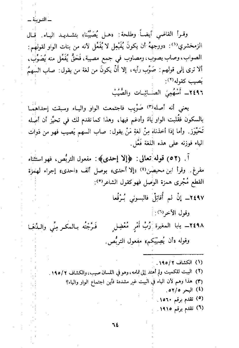 وقرأ القاضي أيضاً وطلحة: «هل يُصَيِّبُنا» بتشديد الياء. قال الزمخشري: «ووجههُ أن يكونَ يُفَيْعِل لا يُفَعِّل لأنه من بنات الواو لقولهم: الصواب، وصاب يصوب، ومصاوب في جمع مصيبة، فَحَقُّ يُفَعِّل منه يُصَوِّب. ألا ترى إلى قولهم: صَوَّب رأيه، إلا أَنْ يكونَ من لغة من يقول: صاب السهمُ يَصيب كقوله: