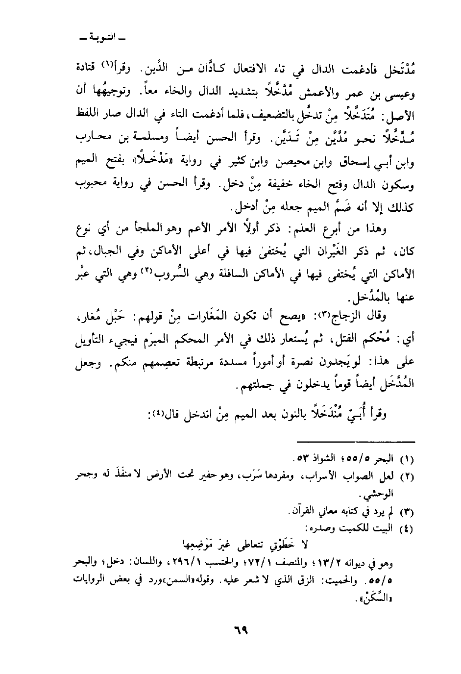 مُدْتَخل فأدغمت الدال في تاء الافتعال كادَّان من الدَّين. وقرأ قتادة وعيسى بن عمر والأعمش مُدَّخَّلاً بتشديد الدال والخاء معاً. وتوجيهُها أن الأصل: مُتَدَخَّلاً مِنْ تَدخَّل بالتضعيف، فلما أدغمت التاء في الدال صار اللفظ مُدَّخَّلاً نحو مُدَّيَّن مِنْ تَدَيَّن. وقرأ الحسن أيضاً ومسلمة بن محارب وابن أبي إسحاق وابن محيصن وابن كثير في رواية «مَدْخَلاً» بفتح الميم وسكون الدال وفتح الخاء خفيفة مِنْ دخل. وقرأ الحسن في رواية محبوب كذلك إلا أنه ضَمَّ الميم جعله مِنْ أدخل.