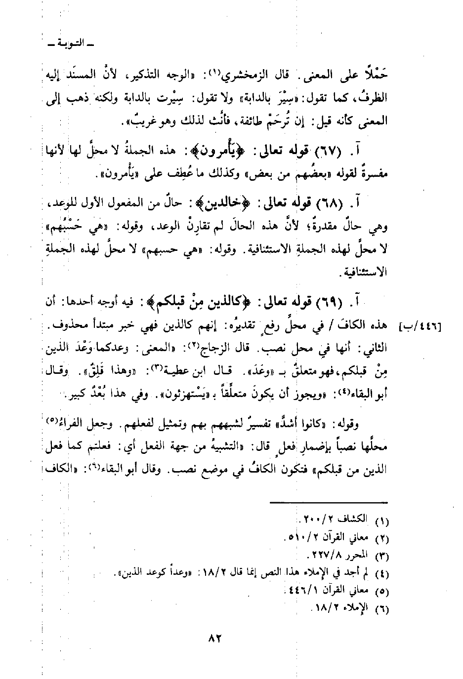قوله تعالى: {كالذين مِن قَبْلِكُمْ} : فيه أوجه أحدها: هذه الكافَ/ في محلِّ رفعٍ تقديرُه: إنهم كالذين فهي خبر مبتدأ محذوف. الثاني: أنها في محل نصب. قال الزجاج: «المعنى: وعدكما وَعْدَ الذين مِنْ قبلكم، فهو متعلقٌ ب» وَعَدَ «. قال ابن عطية:» وهذا قَلِقٌ «. وقال أبو البقاء:» ويجوز أن يكونَ متعلِّقاً ب «يَسْتهزئون» . وفي هذا بُعْدٌ كبير.