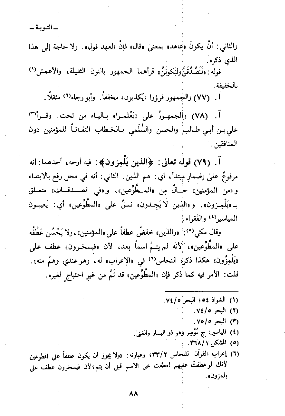 وقال مكي: «والذين» خفضٌ عطفاً على «المؤمنين» ، ولا يَحْسُن عَطْفُه على «المطَّوِّعين» ، لأنه لم يتمَّ اسماً بعد، لأن «فيسخرون» عطف على «يَلْمِزُون» هكذا ذكره النحاس في «الإِعراب» له، وهو عندي وهمٌ منه «. قلت: الأمر فيه كما ذكر فإن» المطَّوِّعين «قد تَمَّ من غيرِ احتياجٍ لغيره.