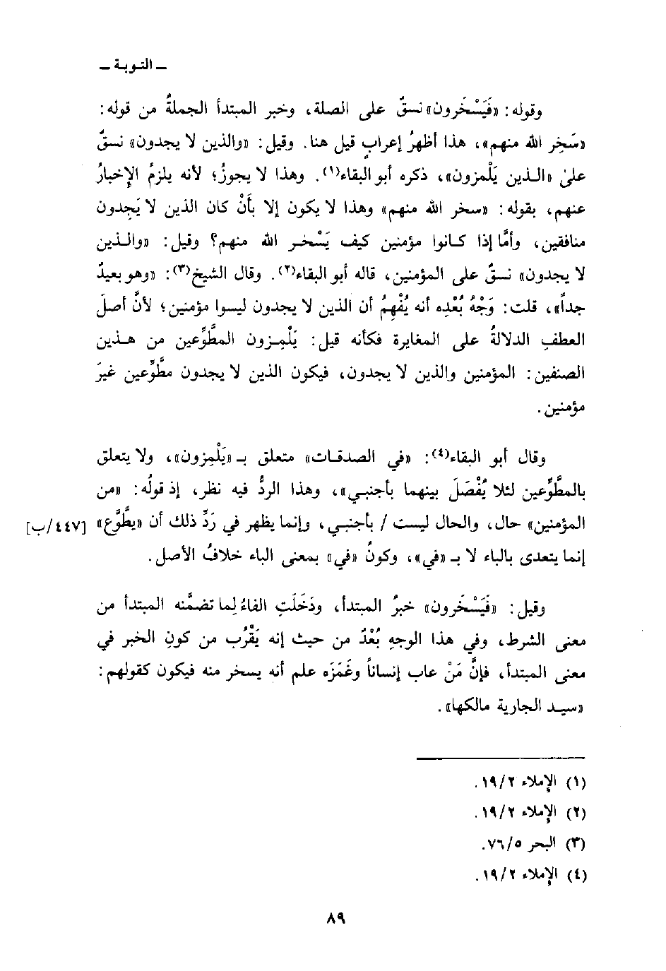 وقال أبو البقاء:» في الصدقات «متعلق ب» يَلْمِزون «، ولا يتعلق بالمطَّوِّعين لئلا يُفْصَل بينهما بأجنبي» ، وهذا الردُّ فيه نظر، إذ قولُه: «من المؤمنين» حال، والحال ليست/ بأجنبي، وإنما يظهر في رَدِّ ذلك أن «يطَّوَّع» إنما يتعدى بالباء لا ب «في» ، وكونُ «في» بمعنى الباء خلافُ الأصل.