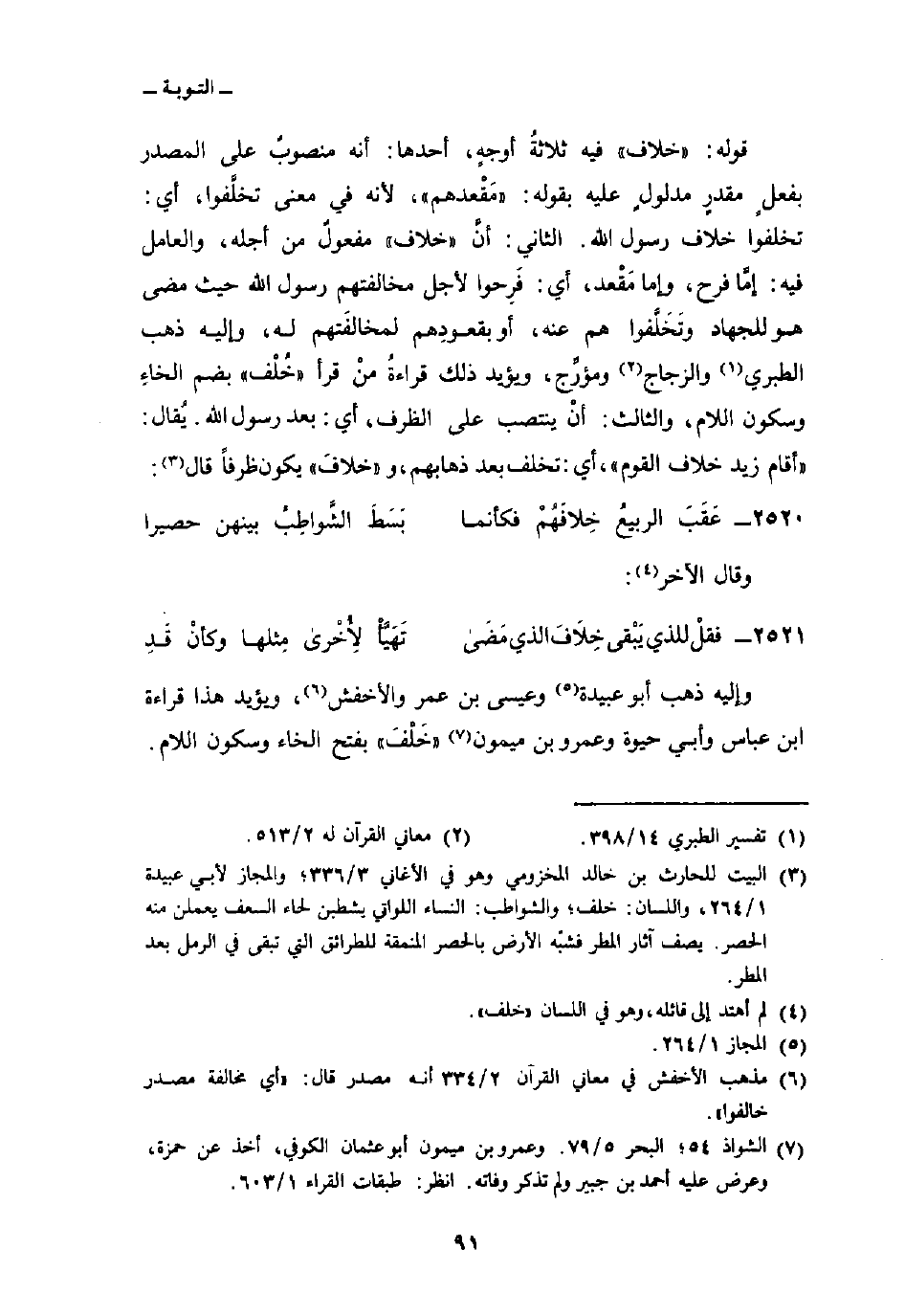 قوله: {خِلاَفَ} فيه ثلاثةُ أوجهٍ، أحدها: أنه منصوبٌ على المصدر بفعلٍ مقدرٍ مدلولٍ عليه بقوله: «مَقْعدهم» ، لأنه في معنى تخلَّفوا، أي: تخلفوا خلاف رسول الله. الثاني: أنَّ «خلاف» مفعولٌ من أجله، والعامل فيه: إمَّا فرح، وإما مَقْعد، أي: فَرِحوا لأجل مخالفتهم رسول الله حيث مضى هو للجهاد وتَخَلَّفوا هم عنه، أو بقعودِهم لمخالفَتهم له، وإليه ذهب الطبري والزجاج ومؤرِّج، ويؤيد ذلك قراءةُ منْ قرأ «خُلْف» بضم الخاءِ وسكون اللام، والثالث: أنْ ينتصب على الظرف، أي: بعد رسول الله. يُقال: «أقام زيد خلاف القوم» ، أي: تخلف بعد ذهابهم، و «خلافَ» يكون ظرفاً قال: