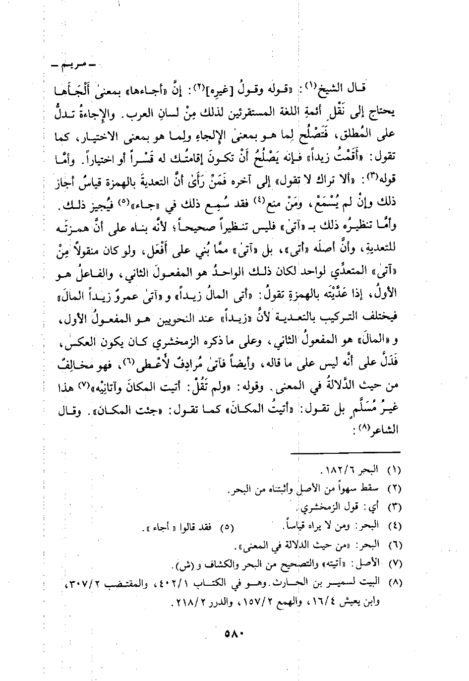 قال الشيخ:» قوله وقولُ [غيرِه] : إنَّ «أجاءها» بمعنى أَلْجَأَها يحتاج إلى نَقْلِ أئمةِ اللغة المستقرئين لذلك مِنْ لسانِ العرب. والإِجاءةُ تدلُّ على المُطلق، فَتَصْلُح لِما هو بمعنى الإِلجاءِ ولِما هو بمعنى الاختيار، كما تقول: «أَقَمْتُ زيداً» فإنه يَصْلُحُ أَنْ تكونَ إقامتُك له قَسْراً أو اختياراً. وأمَّا قوله: «ألا ترك لا تقول» إلى آخره فَمَنْ رَأَى أنَّ التعديةَ بالهمزة قياسٌ أجاز ذلك وإنْ لم يُسْمَعْ، ومَنْ منع فقد سُمِع ذلك في «جاء» فيُجيز ذلك. وأمَّا تنظيرُه ذلك ب «آتى» فليس تنظيراً صحيحاً؛ لأنَّه بناه على أنَّ همزتَه للتعديةِ، وأنَّ أصلَه «أتى» ، بل «آتى» ممَّا بُني على أَفْعَل، ولو كان منقولاً مِنْ «آتى» المتعدِّي لواحد لكان ذلك الواحدُ هو المفعولَ الثاني، والفاعلُ هو الأولُ، إذا عَدَّيْتَه بالهمزةِ تقولُ: «أتى المالُ زيداً» و «آتى عمروٌ زيداً المالَ» فيختلف التركيب بالتعدية لأنَّ «زيداً» عند النحويين هو المفعولُ الأول، و «المالُ» هو المفعولُ الثاني، وعلى ما ذكره الزمخشري كان يكون العكس، فَدَلَّ على أنَّه ليس على ما قاله، وأيضاً فآتى مُرادِفٌ لأَعْطَى، فهو مخالِفٌ من حيث الدَّلالةُ في المعنى. وقوله: «ولم تَقُلْ: أتيت المكانَ وآتانِيْه» هذا غيرُ مُسَلَّمٍ بل تقول: «أتيتُ المكانَ» كما تقول: «جئت المكان» . وقال الشاعر:
