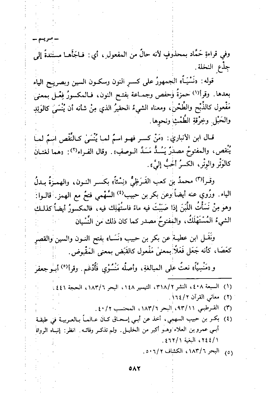 قوله: «نَسْيَاً» الجمهورُ على كسرِ النون وسكون السين وبصريح الياء بعدها. وقرأ حمزةُ وحفص وجماعة بفتح النون، فالمكسورُ فِعْلُ بمعنى مَفْعول كالذَّبْح والطَّحْن، ومعناه الشيءُ الحقيرُ الذي مِنْ شأنه أن يُنْسَى كالوَتِدِ والحَبْلِ وخِرْقةِ الطَّمْثِ ونحوِها.