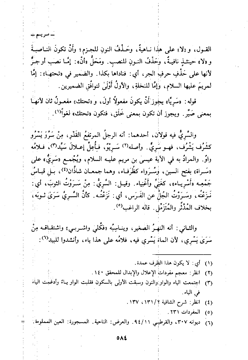 والسَّرِيُّ فيه قولان، أحدهما: أنه الرجلُ المرتفعُ القَدْرِ، مِنْ سَرُوَ يَسْرُو كشَرُف يَشْرُف، فهو سَرِيٌّ. وأصله سَرِيْوٌ، فأُعِلَّ إعلالَ سَيِّد، فلامُه واوٌ. والمرادُ به في الآية عيسى بن مريم عليه السلام، ويُجْمع» سَرِيُّ «على» سَراة «بفتح السين، وسُرَواء كظُرَفاء، وهما جمعان شاذَّان، بل قياسُ جَمْعِه» أَسْرِياء «، كغنِيِّ وأَغْنِياء. وقيل: السَّرِيُّ: مِنْ سَرَوْتُ الثوبَ، أي: نَزَعْتُه، وسَرَوْتُ الجُلَّ عن الفَرَس، أي: نَزَعْتُه. كأنَّ السَّرِيَّ سَرَى ثوبَه، بخلاف المُدَّثِّر والمُتَزَمِّل. قاله الراغب.
