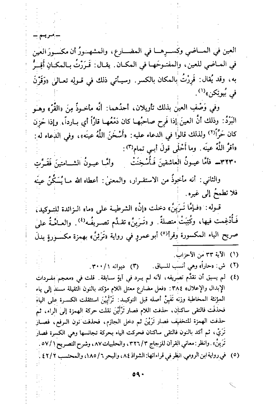 وفي وَصْفِ العين بذلك تأويلان، أحدُهما: أنَّه مأخوذٌ مِنَ «القُرّ» وهو البَرْدُ: وذلك أنَّ العينَ إذا فَرِح صاحبُها كان دَمْعُها قارَّاً أي بارداً، وإذا حَزِن كان حَرَّاً ولذلك قالوا في الدعاء عليه: «أَسْخَنَ اللهُ عينَه» ، وفي الدعاء له: «أقرَّ اللهُ عينَه. وما أَحْلى قولَ أبي تمام: