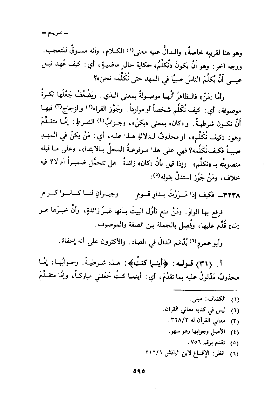 وأمَّا» مَنْ «فالظاهرُ أنَّها موصولةٌ بمعنى الذي. ويَضْعُفُ جَعْلُها نكرةً موصوفة، أي: كيف نُكَلِّم شخصاً أو مولوداً. وجَوَّز الفراء والزجاج فيها أَنْ تكون شرطيةً. و» كان «بمعنى» يكنْ «، وجوابُ الشرطِ: إمَّا متقدِّمٌ وهو» كيف نُكَلِّم «، أو محذوفٌ لدلالةِ هذا عليه، اي: مَنْ يكنْ في المهدِ صبياً فكيف نُكَلِّمه؟ فهي على هذا مرفوعةُ المحلِّ بالابتداءِ، وعلى ما قبله منصوبتُه ب» نكلِّم «. وإذا قيل بأنَّ» كان «زائدةٌ. هل تتحمَّل ضميراً أم لا؟ فيه خلاف، ومَنْ جَوَّز استدلَّ بقوله: