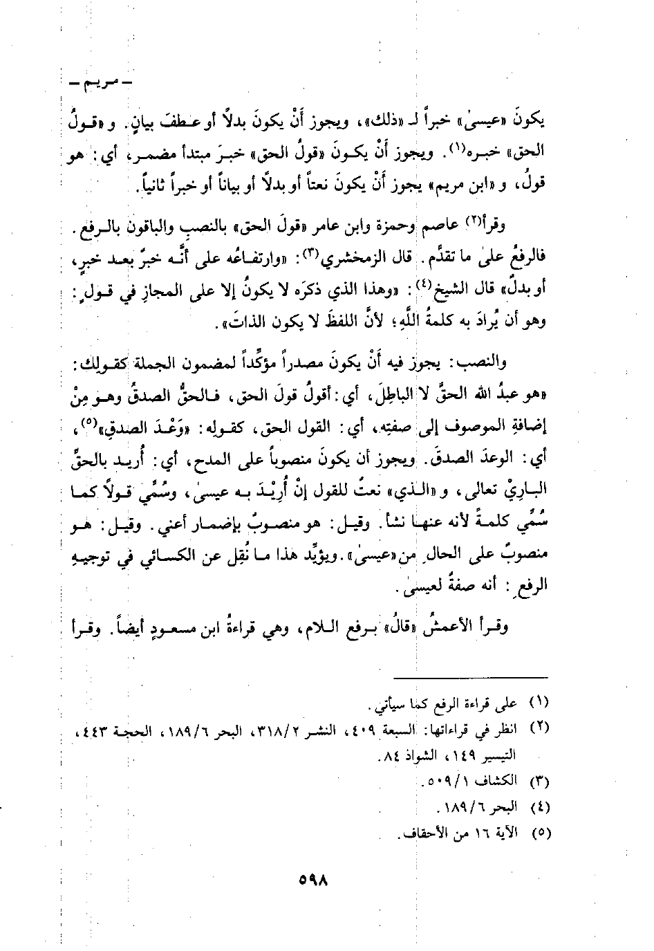 يكونَ «عيسى» خبراً ل «ذلك» ، ويجوز أَنْ يكونَ بدلاً أو عطفَ بيانٍ. و «قولُ الحق» خبره. ويجوز أَنْ يكونَ «قولُ الحق» خبرَ مبتدأ مضمر، أي: هو قولُ: و «ابن مريم» يجوز أَنْ يكونَ نعتاً أو بدلاً أو بياناً أو خبراً ثانياً.