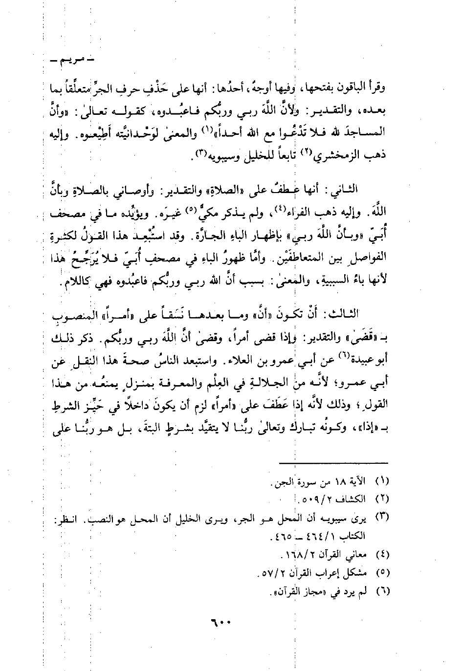 الثاني: أنها عطفٌ على «الصلاةِ» والتقدير: وأوصاني بالصلاةِ وبأنَّ اللهَ. وإليه ذهب الفراء، ولم يذكر مكيٌّ غيرَه. ويؤيِّده ما في مصحف أُبَيّ «وبأنَّ اللهَ ربي» بإظهار الباءِ الجارَّة. وقد استُبْعِد هذا القولُ لكثرةِ الفواصلِ بين المتعاطفَيْن. وأمَّا ظهورُ الباءِ في مصحفِ أَُبَيّ فلا يُرَجِّحُ هذا لأنها باءُ السببيةِ، والمعنى: بسبب أنَّ الله ربي وربُّكم فاعبُدوه فهي كاللام.